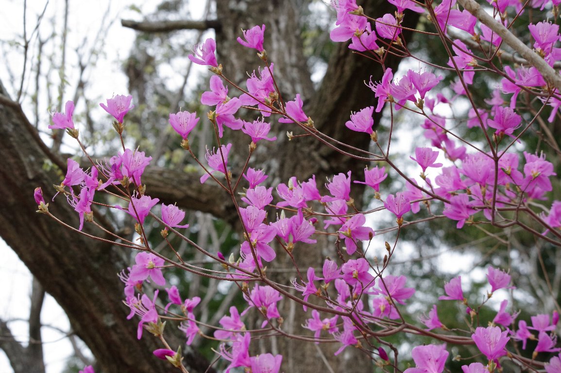 林の縁のあちこちが、濃いピンク色で彩られている。 どうやら、コバノミツバツツジの当たり年のようだ。 曇り空だったが、見上げて撮ると、チョウが乱舞しているようだった。 |