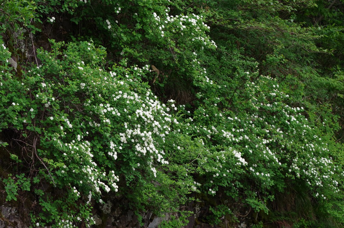道端の岩場一帯に、見事に咲いているシモツケの仲間の花に出くわした。 後で調べたところ、おそらく、イワガサと思われる。 岩傘とは、粋な名前だ。すっかり気に入ってしまった。 |