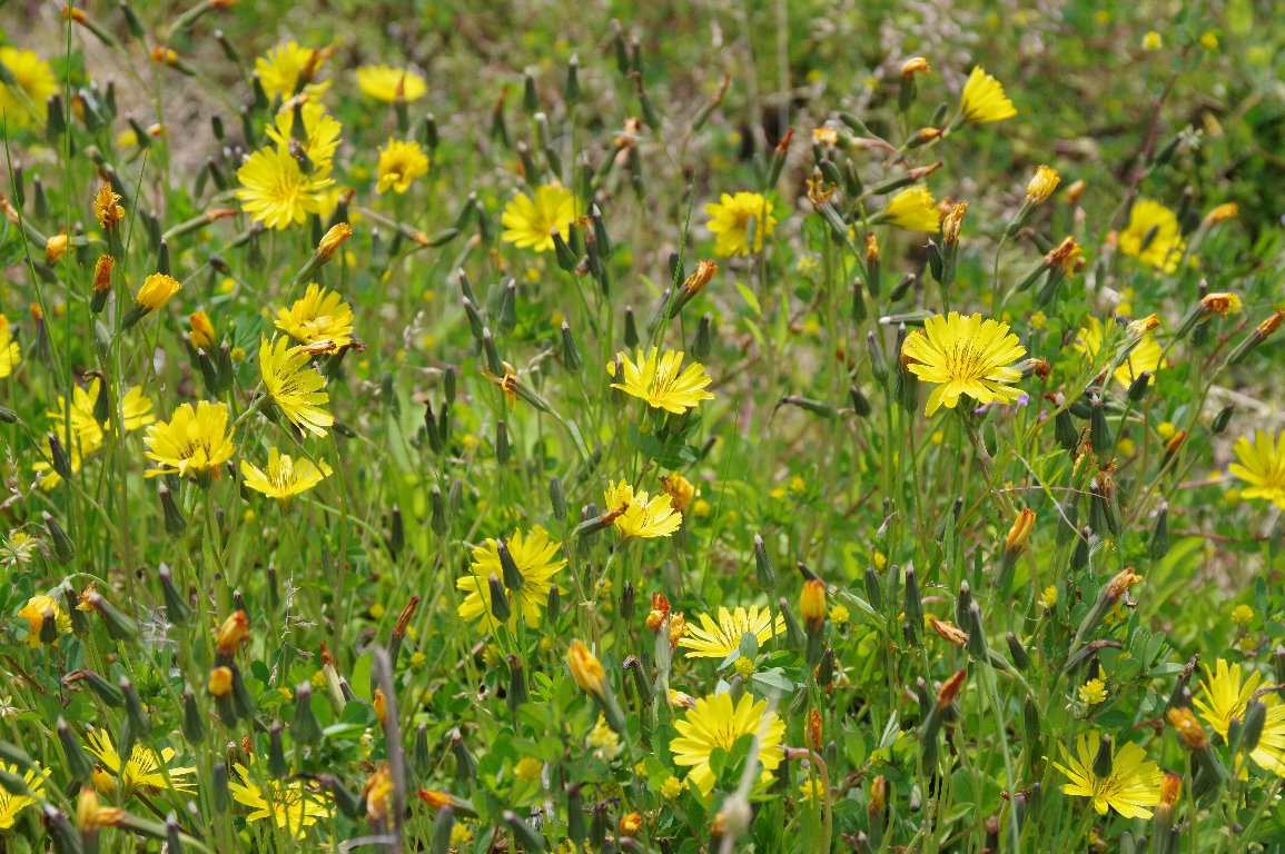 休耕田に、オオジシバリの花が広がって咲いていた。 いちめんの黄色に、どこをどう撮ったらいいのか、迷ってしまう。 そのごく一部を、そっと、切り取った。 |