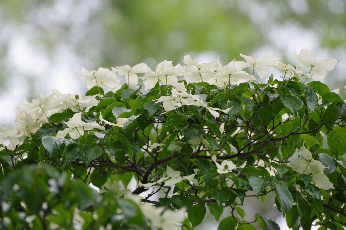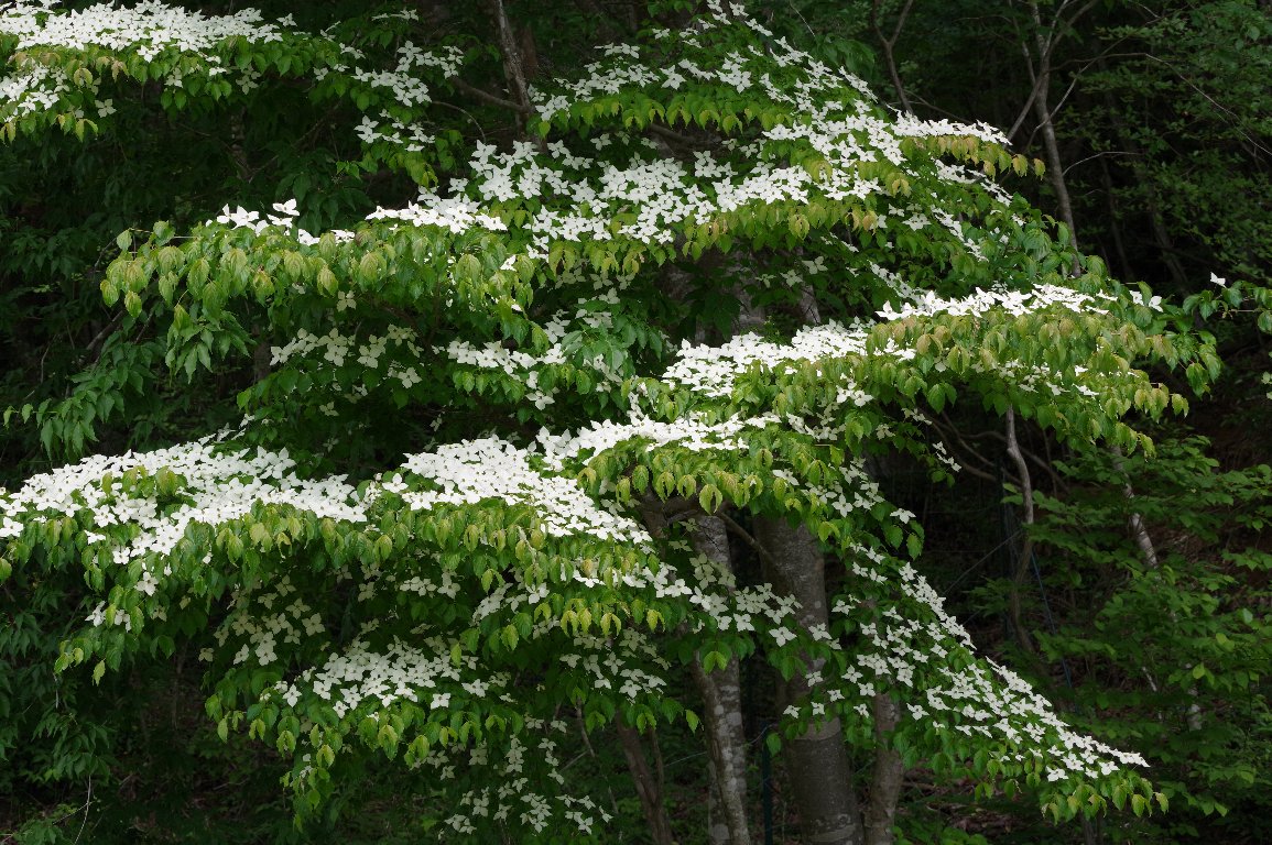 ヤマボウシが、例年にないくらい、たくさんの花を咲かせている。 ここの里山公園でも、こんなにヤマボウシの木があったのかと思うくらい、 あっちでも、こっちでも、木々の緑の中に、白い花が浮かび上がっていた。 |