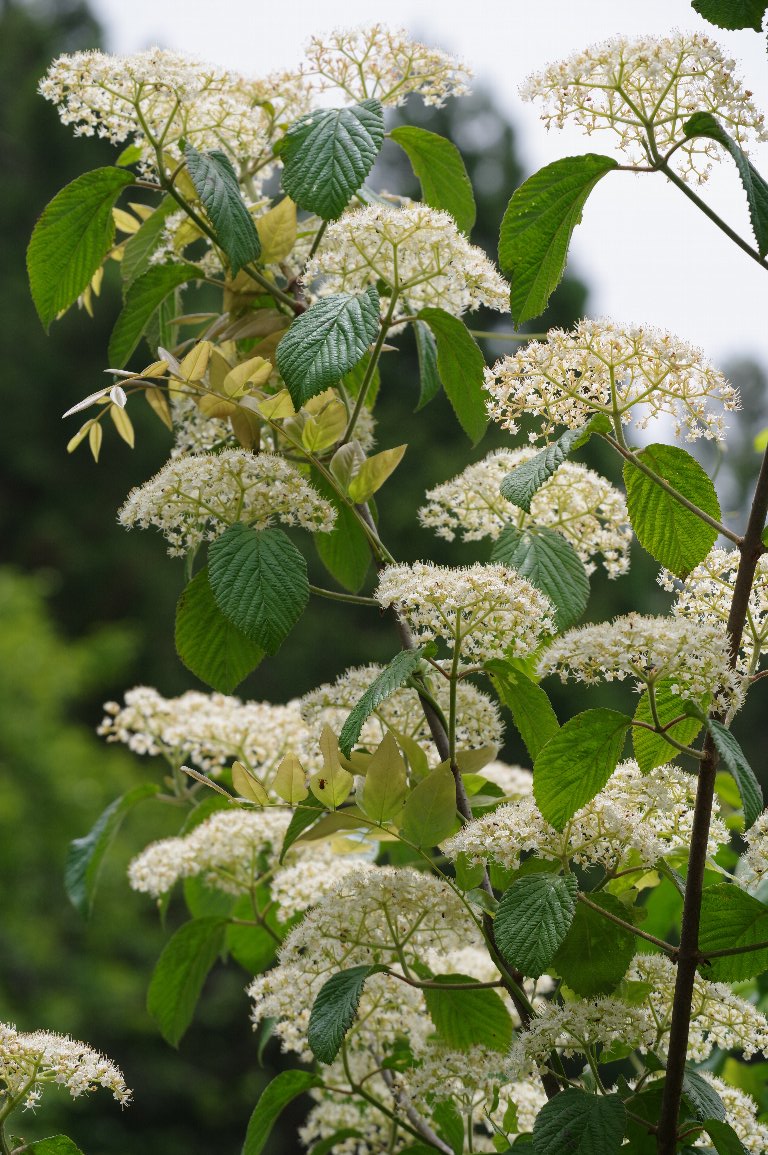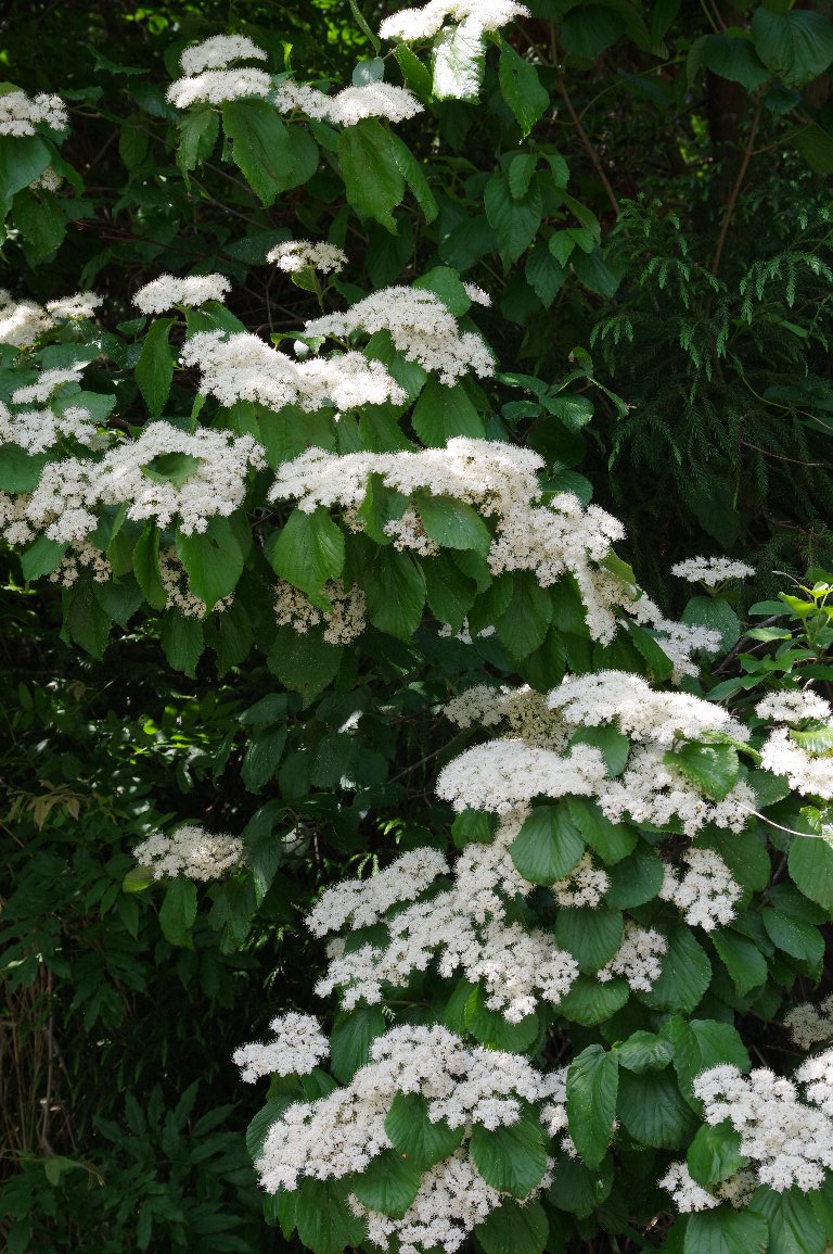 川沿いの道路の、ちょっとした薮で、ガマズミの花が咲き始めていた。 まだ、満開より少し手前の、わずかに黄味がかった花が、みずみずしい。 上へ上へと向かってゆくように咲いていた。 |