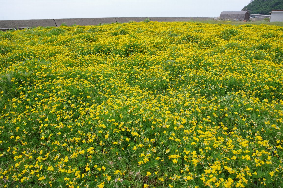 海沿いの草はらを覆い尽くすように、黄色い絨毯が広がっていた。ミヤコグサの花だ。 それにしても、見事ないちめんの花。華やかな黄色が、海岸を彩っていた。 |