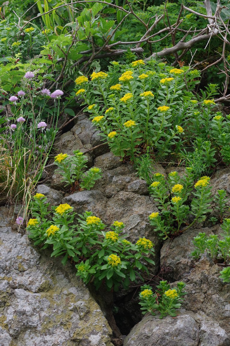 岩場の隙間に根を下ろして、キリンソウの花が咲いていた。 肉厚の葉っぱが乾燥に絶える力を与えており、こんなところでも元気なのだろう。 岩の中に「黄」一点、鮮やかさが際立っていた。 |