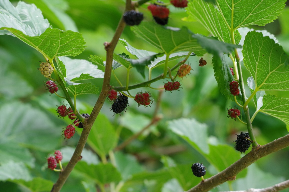 山道を歩いていると、ヤマグワの木に、いちごが生っていた。 全く熟していない青い実、熟しかけた赤い実、そして、完熟の黒い実。 撮影後、黒い実をひとつ、ほおばった。 |