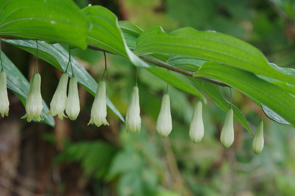 鳴子百合とは言い得て妙で、葉姿はユリ、鳴子のような花がずらっと並んで咲く。 一回り大きい、オオナルコユリは、本当にカラカラと音がしそうだ。 薮の草むらから、すっくと伸びたその姿は、雄々しいと思った。 |