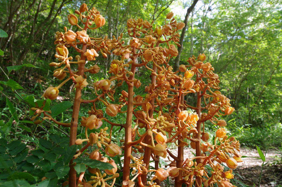 葉緑素を持たない植物は、花が咲く時、林の中に忽然と現れる。 このツチアケビも、湿地へ向かう山道のわきに、いきなり咲いていたので驚いた。 割と人も通るので、採られたり、折られたりしないでいてくれよ、と思わずにはいられなかった。 |