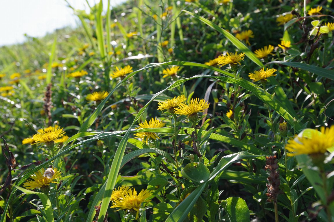 撮影雑記: カセンソウは、必ずしも海岸に咲く花ではないようですが、丹後の海岸では、 よく見かけます。 でも、まばらに咲いていたり、花が今一つだったり、これまで、パッとする 写真が撮れないでいました。 今回、やっと、咲き揃った群落に出会えました。 朝の日差しを浴びて広がる群落が、きれいですね。 ![]() 上から見た、群落の写真です。 冒頭の写真は、ここの一部を切り取ったものですが、群落全体でも絵になりますね。 ![]() カセンソウは、歌仙草と書くようです。でも、由来は不明なのだとか。 歌仙草も、当て字なんでしょうね。 |