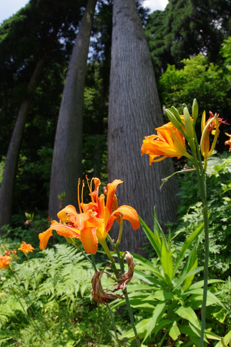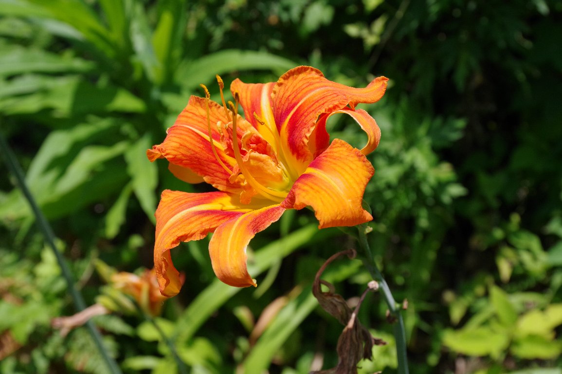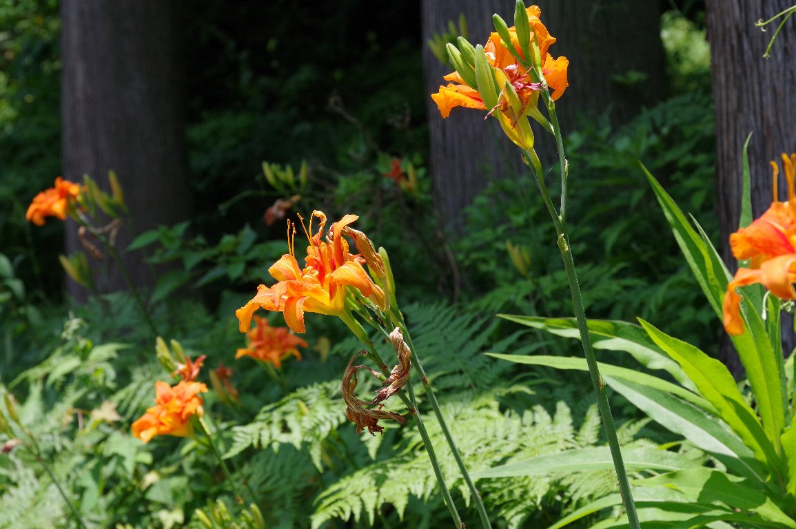 真夏、里山には、むせかえるほどの、濃い緑の薮や草むらが広がる。 その中に、負けじと、鮮やかなオレンジ色の花が点々と咲いていた。 なんとも暑苦しい、ヤブカンゾウの花だ。 |