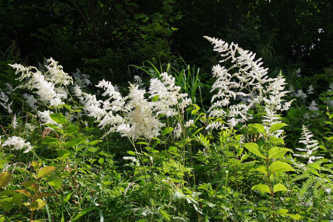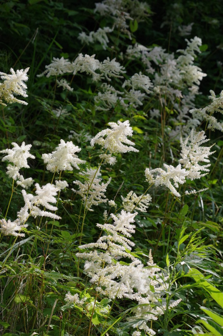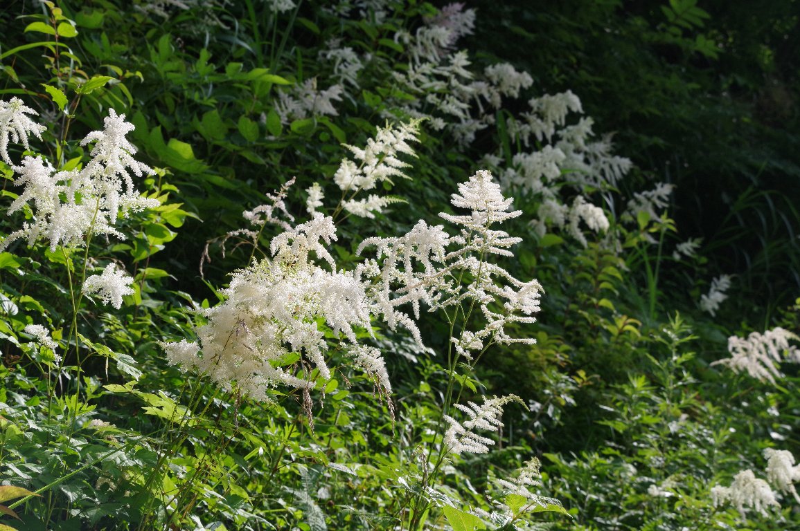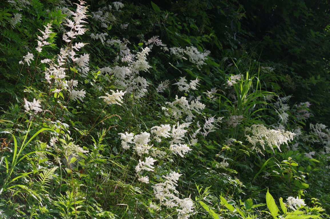 林道を走っていると、ところどころ、ショウマの白い花が咲いている。 と、なんと、切り崩した斜面を埋め尽くす、大群落に出くわした。 おそらくトリアシショウマと思われる、白い花の競演。見事な光景だった。 |