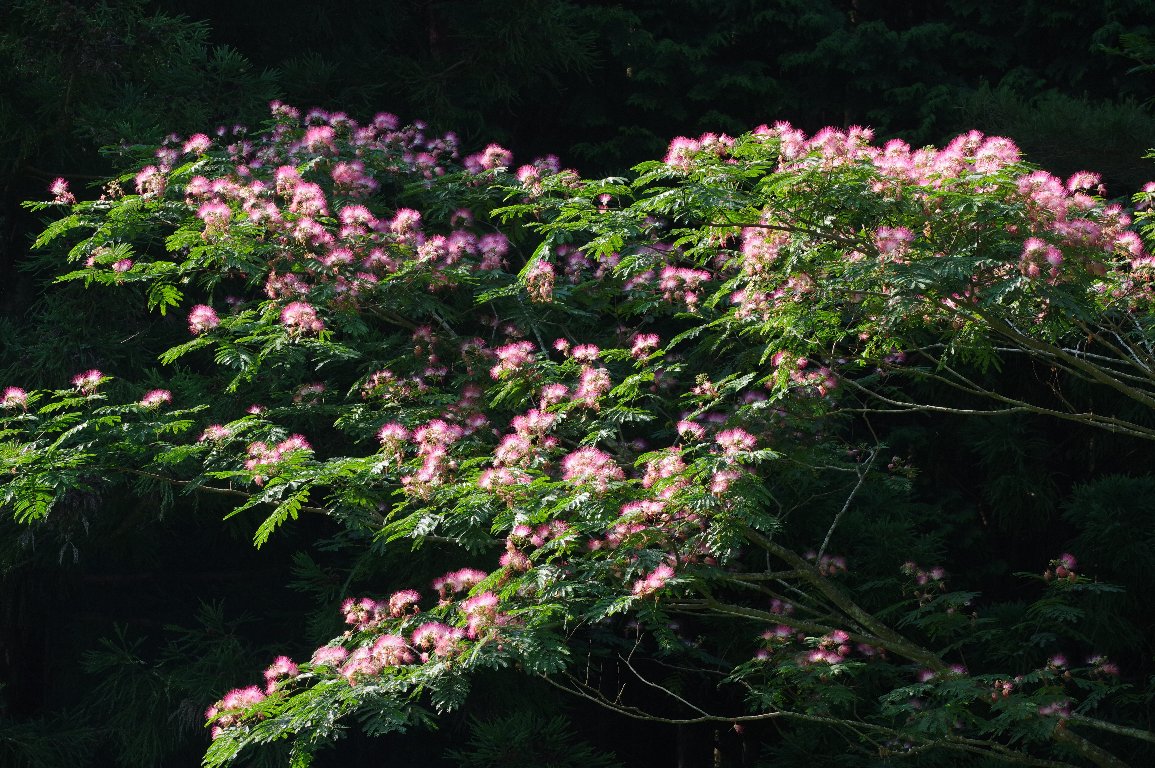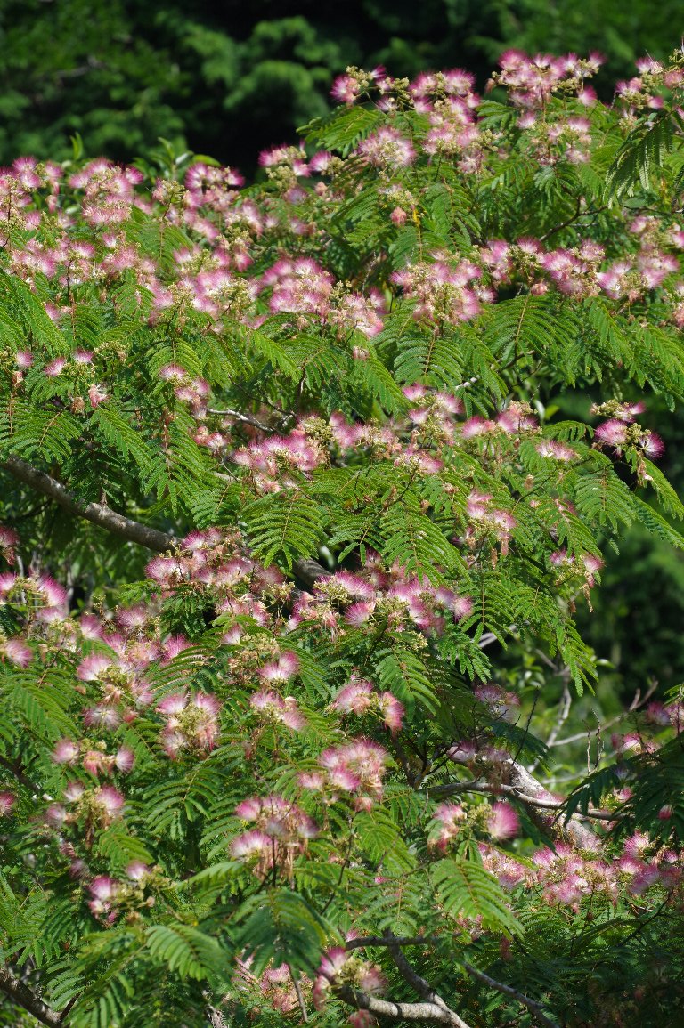 この夏は、ネムノキの当たり年のようだ。 ドライブしていると、山のあちこちで、濃いピンクに咲き誇るネムノキに出会う。 ふわふわの花が、まるで、ピンクの羽飾りのようだった。 |