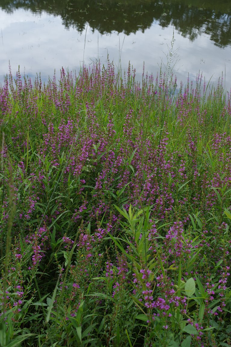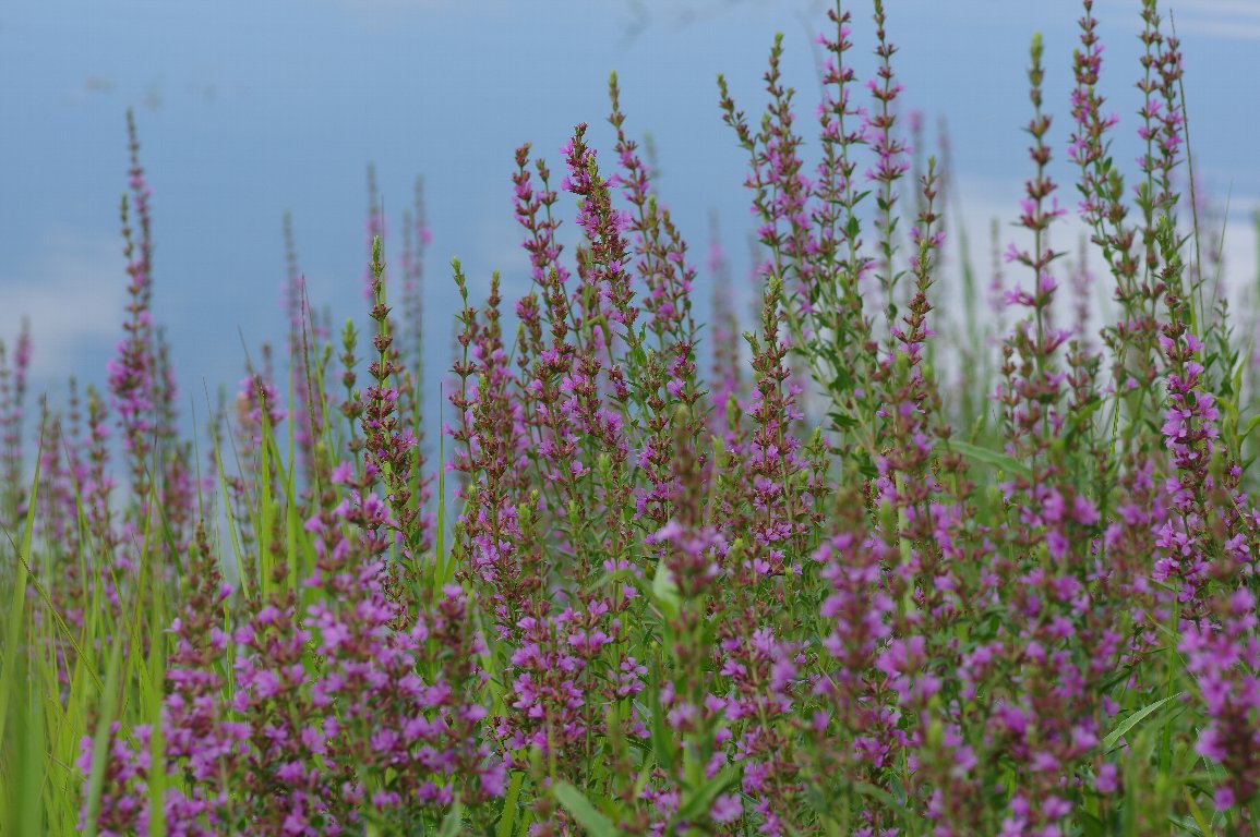 道路横の、大きなため池。そのほとりが、ピンクに染まって見えた。 車を停めて、田んぼ道を歩いて、やっと近づく。 青空を写す池をバックに咲いていたのは、群生するミソハギだった。 |