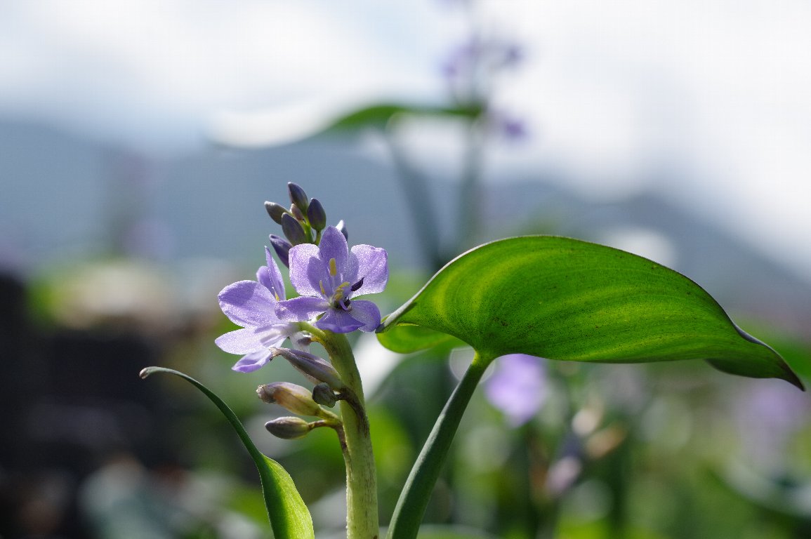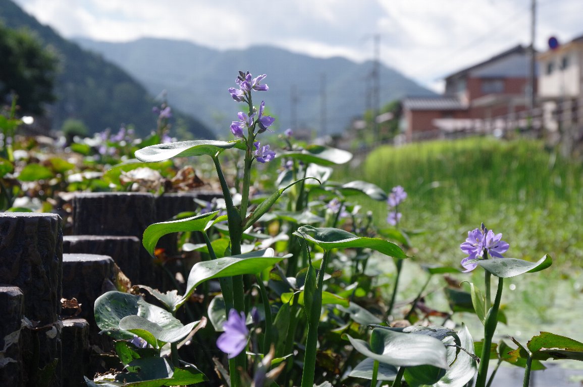 出石の街を流れる谷山川では、ミズアオイの保全が行われている。 この年は、台風などの影響で、開花状況が良くなかったが、それでも、きれいな青紫色の 花が、水面に映えていた。 |