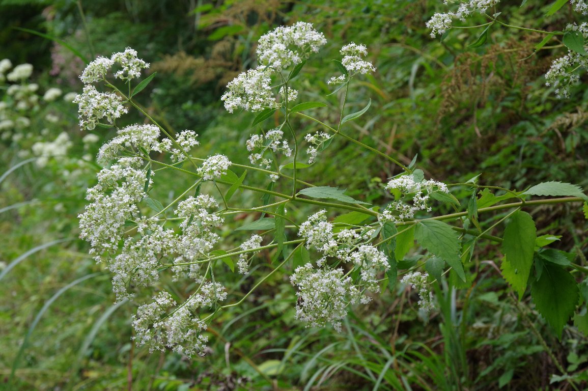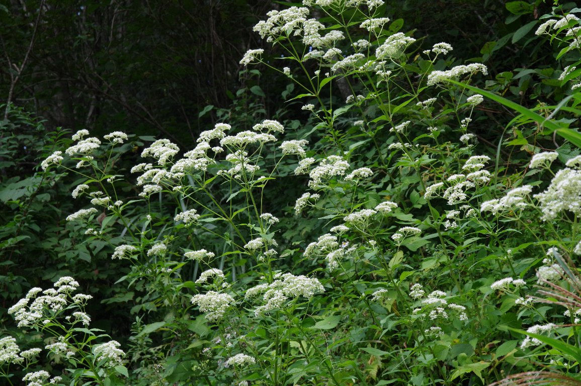 初秋の山道をドライブしていると、しばしば、土手にオトコエシが群生している。 細かな白い花を米の飯、すなわち「男飯」見立てた名前がオトコエシと言われる。 まだまだ暑い日々の中、力強く咲いていた。 |