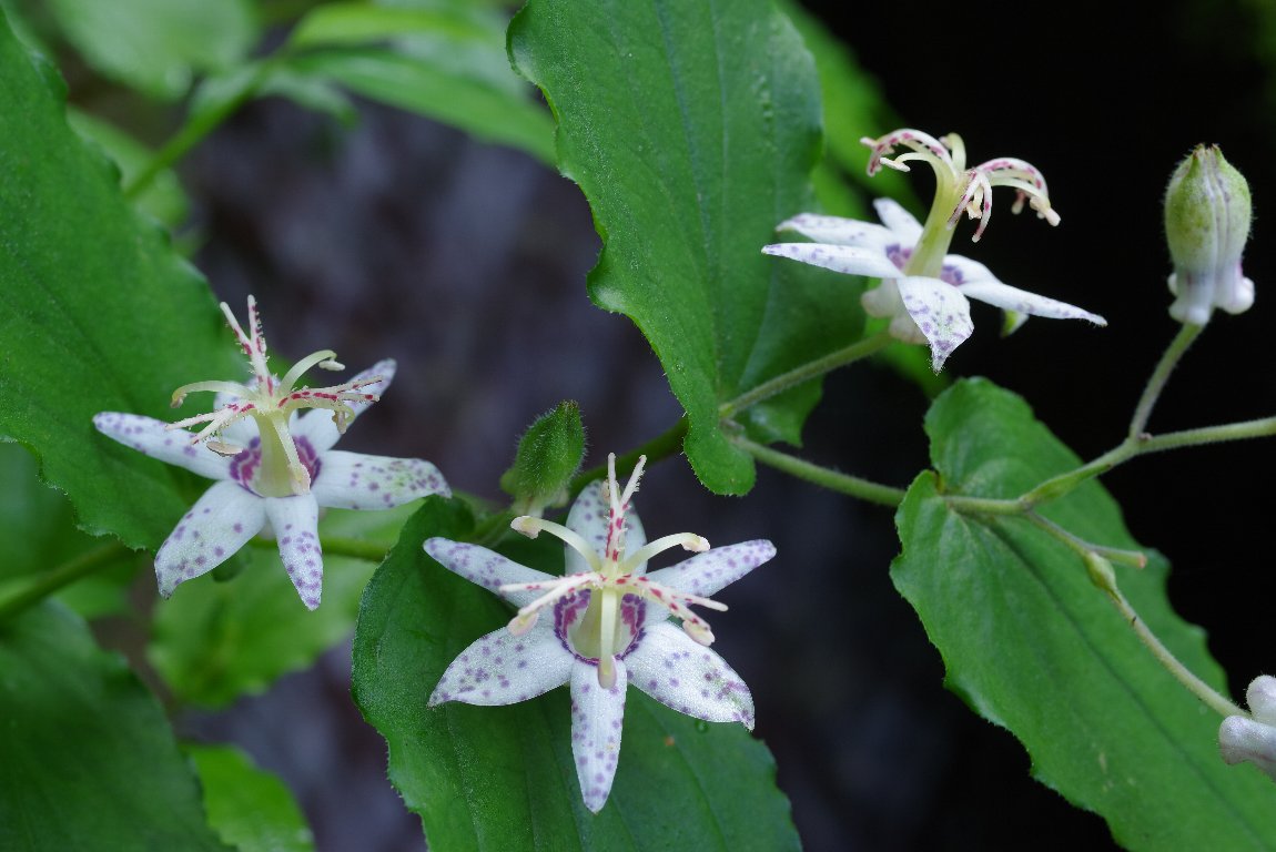 山道の道端に、さりげなく、ヤマジノホトトギスが咲いていた。 側溝に流れる水の上に、張り出すように伸びた茎。そこに、点々と咲く花が、 とてもきれいだった。 |