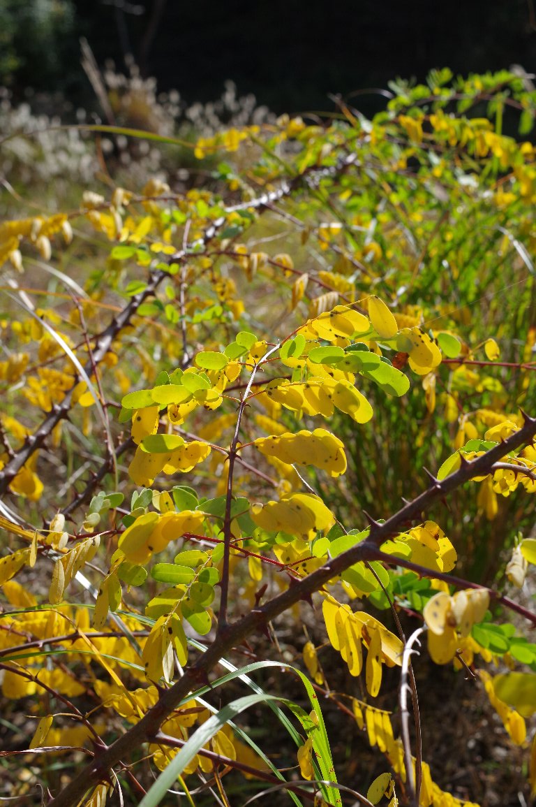 地面を這うような枝の、細かい丸い葉っぱが、黄葉していた。 何だろうと思ってよく見ると、とげとげの枝、ジャケツイバラだ。 こんな風に黄葉することを、初めて知った。 |