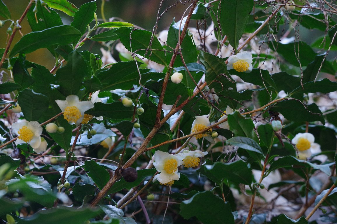 知られていないと思う。 チャノキは、ツバキに似た可憐な白い花を、晩秋に咲かせている。 |