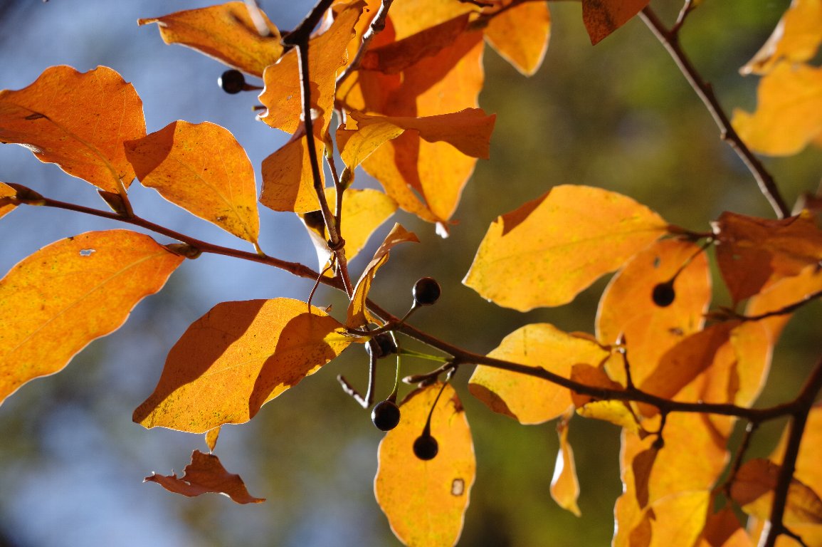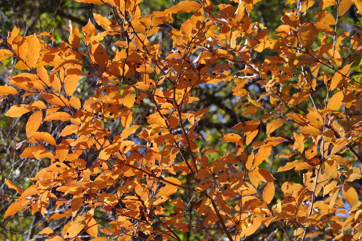 穏やかなオレンジ色の紅葉に、長い柄をつけた黒い小さな実が生っている。 何の木かわからないまま写真に撮り、帰ってから調べると、ヤマコウバシとわかった。 図鑑で、名前だけは覚えていたが、やっと、実物とリンクした。 |