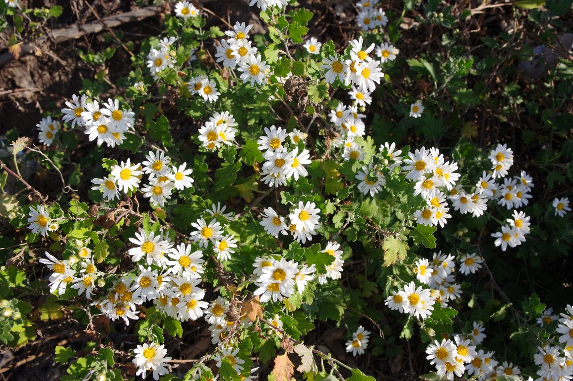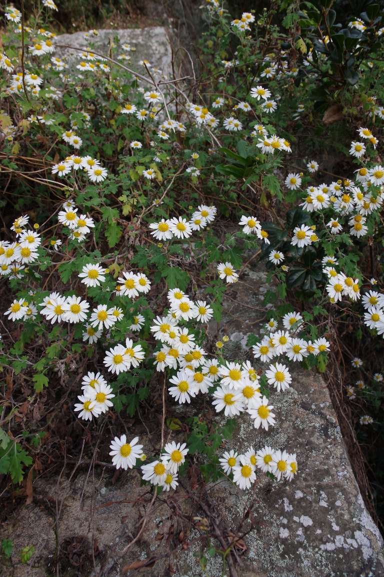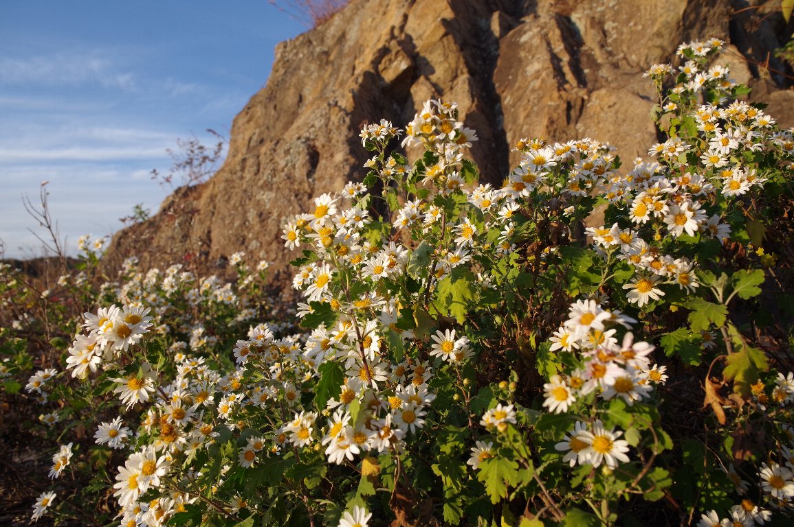 かつては、ノジギクの白い花で覆われていたという、姫路の海岸。 少なくなったとはいえ、岩場などに、今でも、ノジギクの花が咲いている。 傾く西日を浴びて、岩の上でひょろっと咲いていたノジギクが、印象的だった。 |