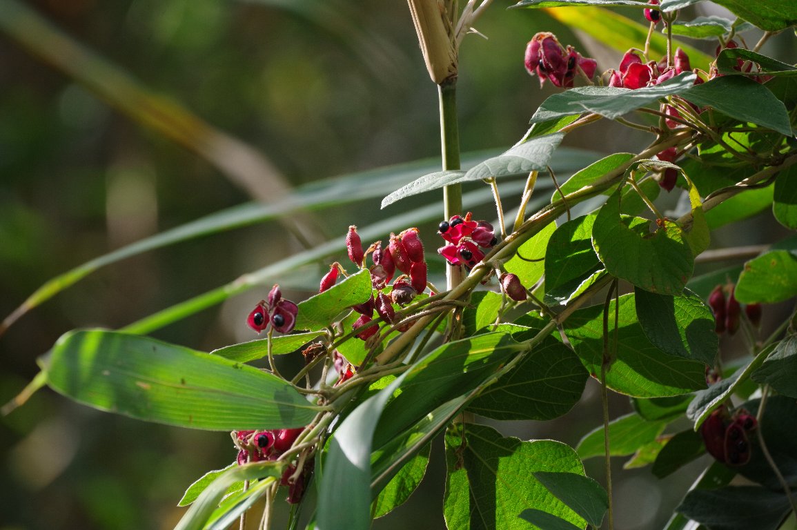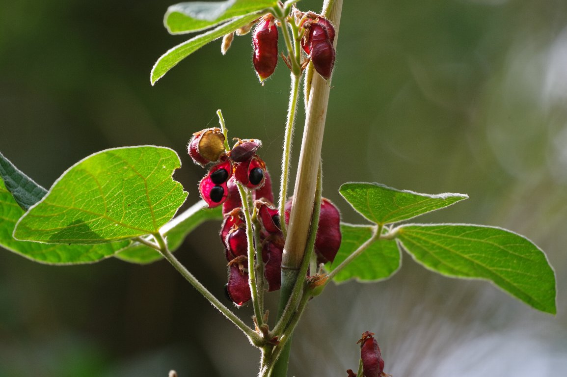 真っ赤なさやの小さな豆は、タンキリマメ。 仲良く二個ずつ並んだ黒い豆が、かわいらしい。 ちょうど射しこんだ光にさやが空けて、とてもきれいだった。 |