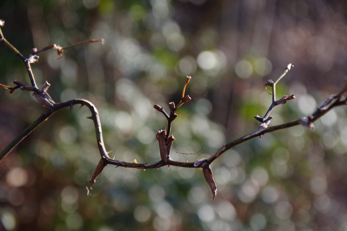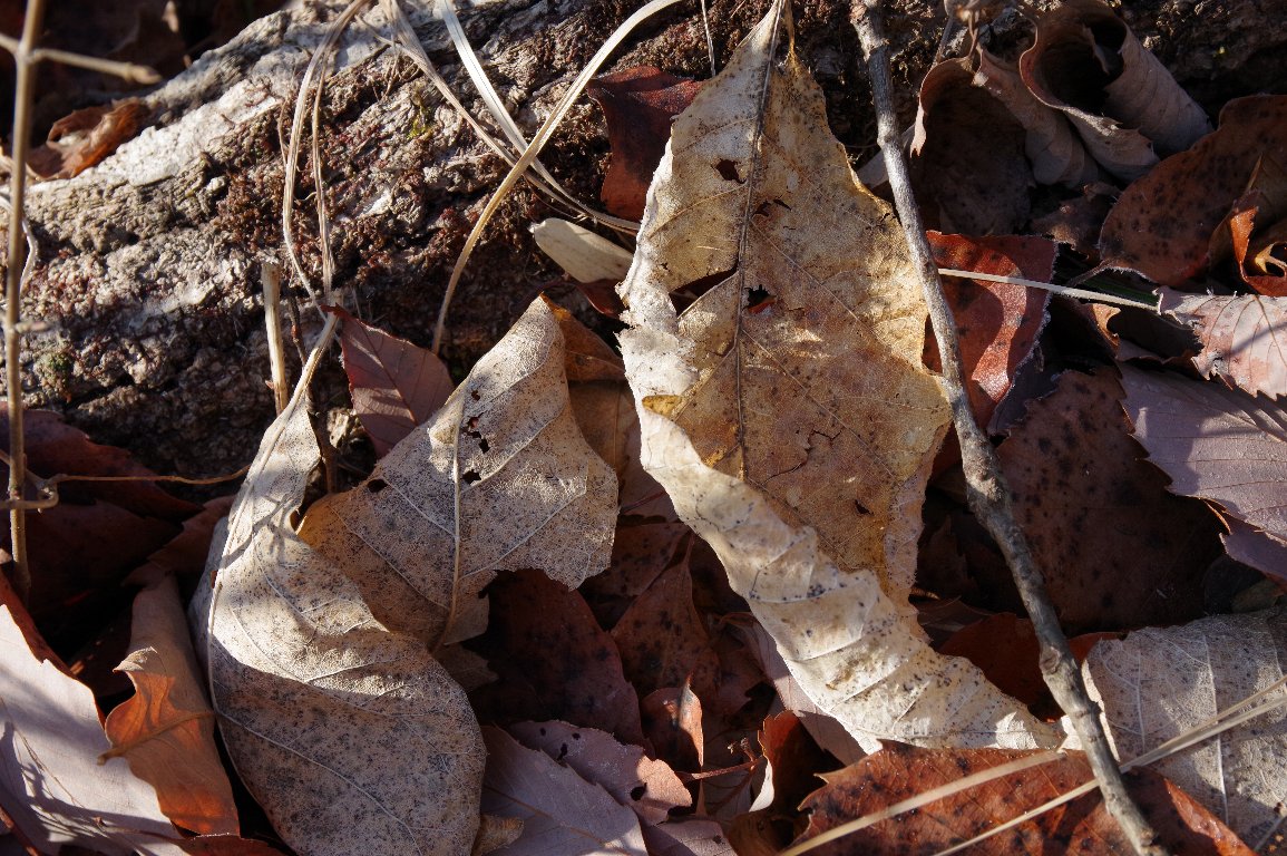 木漏れ日が当たったササの葉に、コアジサイの枯れ花が、影を落としていた。 色の少ない冬の林を歩いていると、こんな、ちょっとした景色を見つけるだけで、 なぜだか嬉しくなってくる。 |
