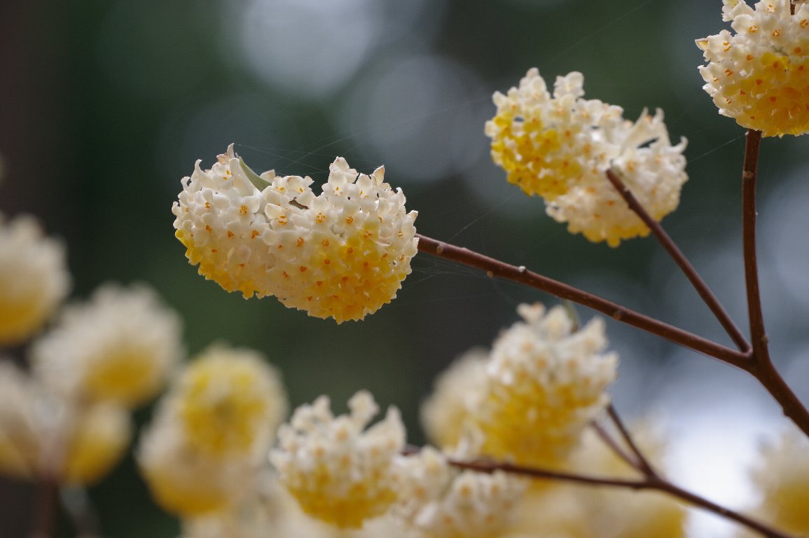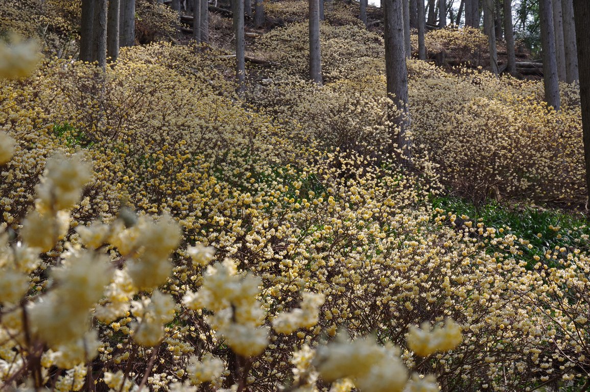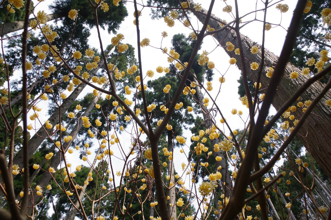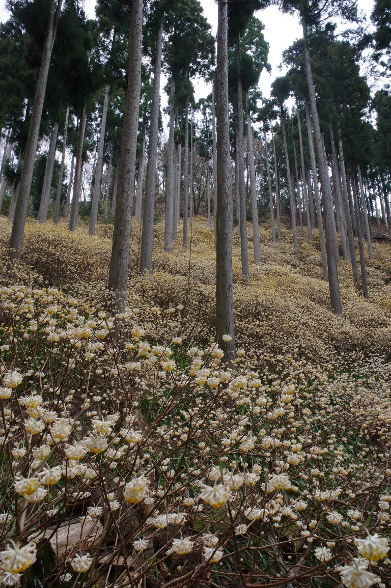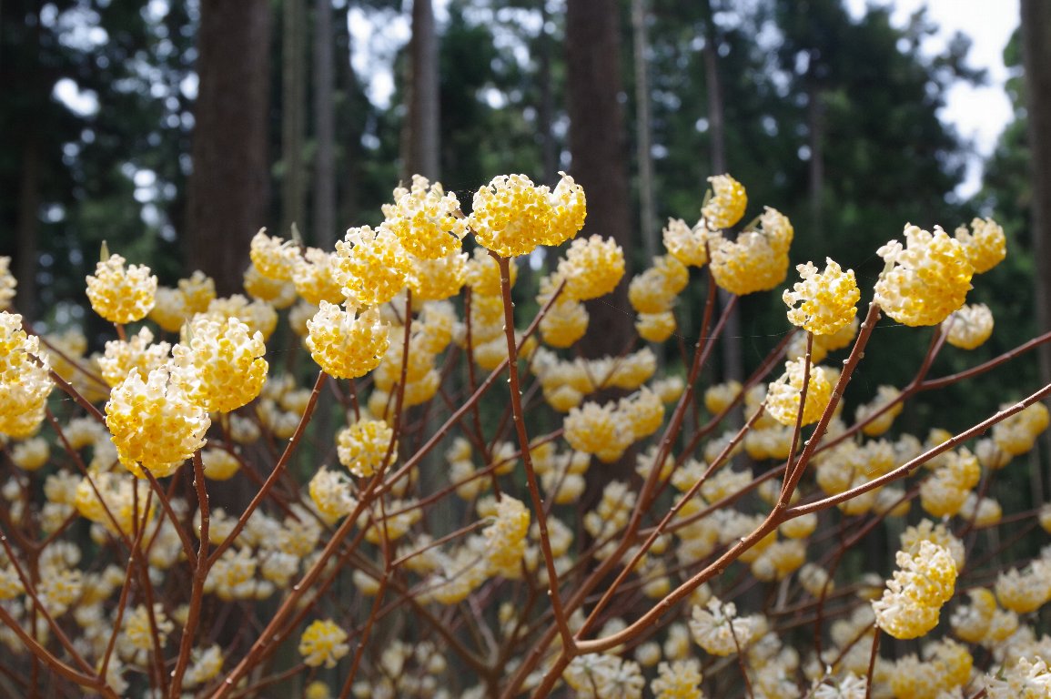 スギ林の下に、それは見事なミツマタ群落が広がっていた。 谷の下から上まで、黄色い絨毯が広がっているようだ。 近づくと、小さな手鞠のような黄色い花が、重なりあって咲いていた。 |
