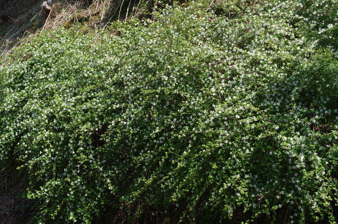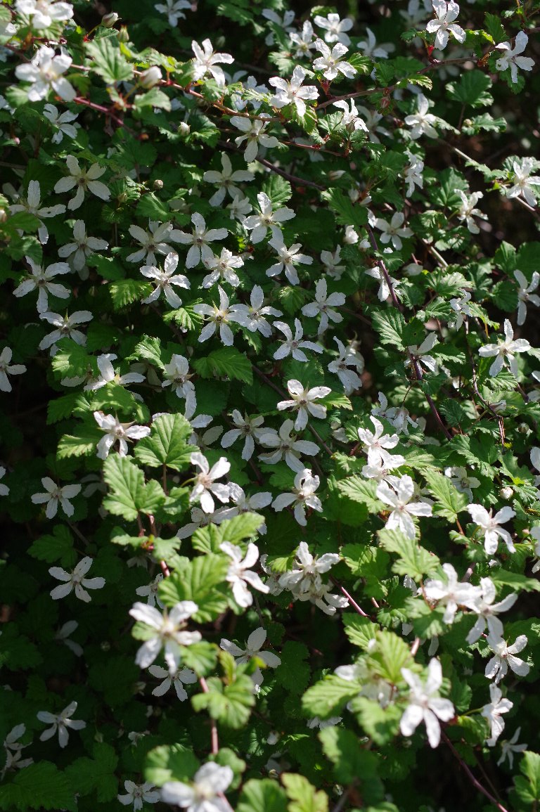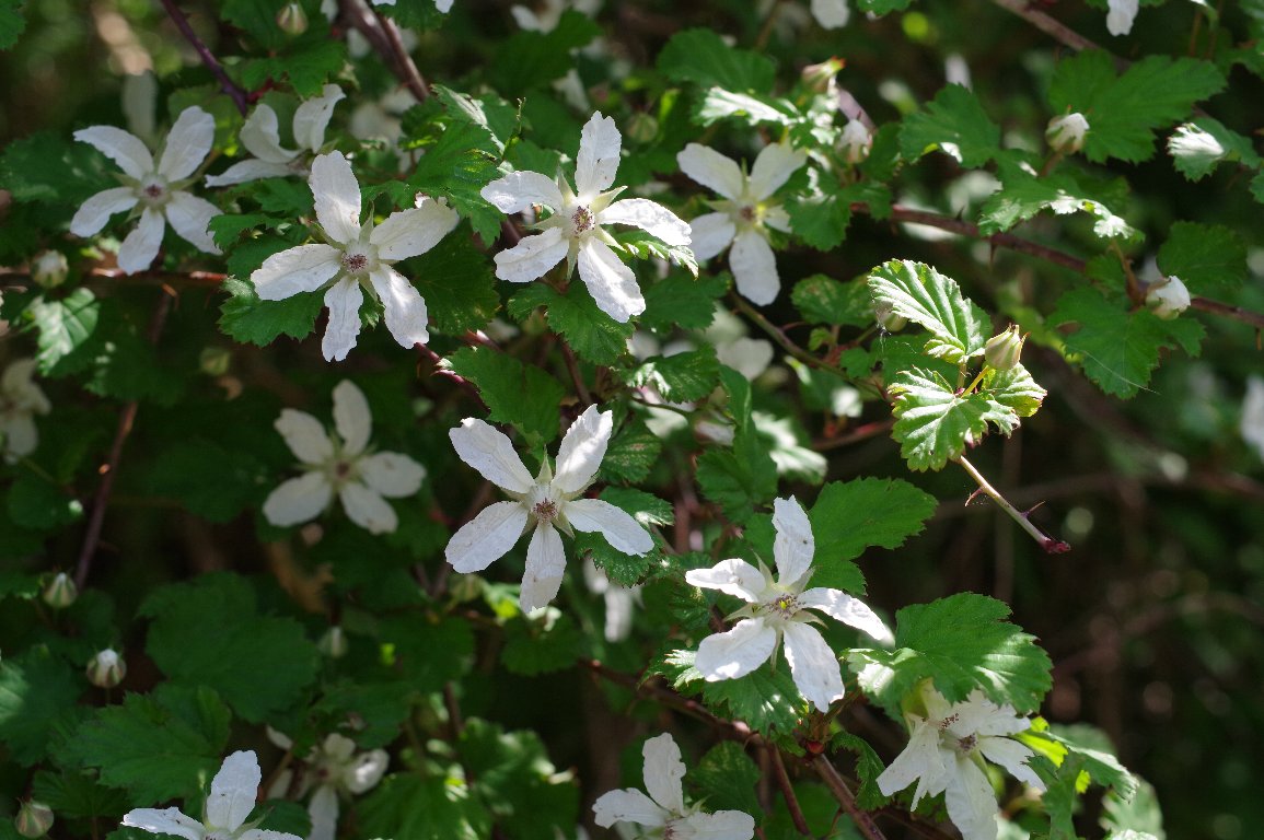 車で山道を走っていると、物凄いニガイチゴの群生に出会った。 白い花が、日差しを浴びて、あきれるほどの密度で咲いている。 いろんな角度、距離から撮ったが、これほど咲いていると、返って難しいものだ。 |