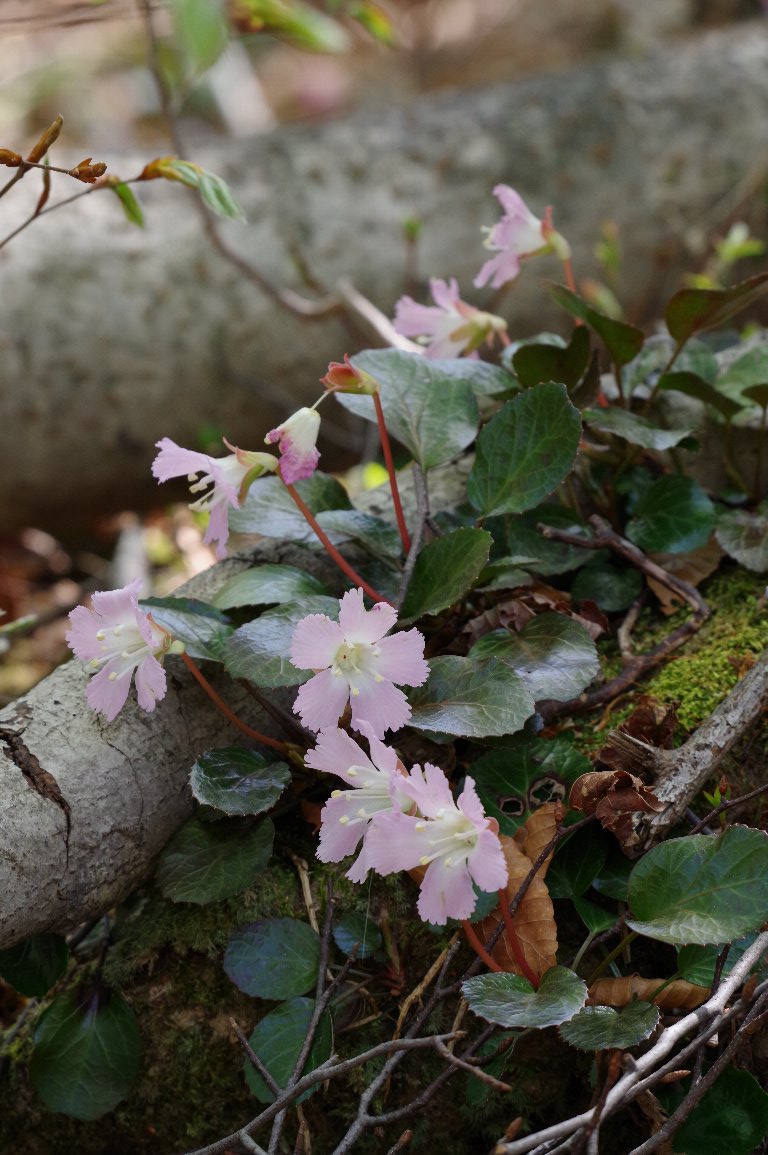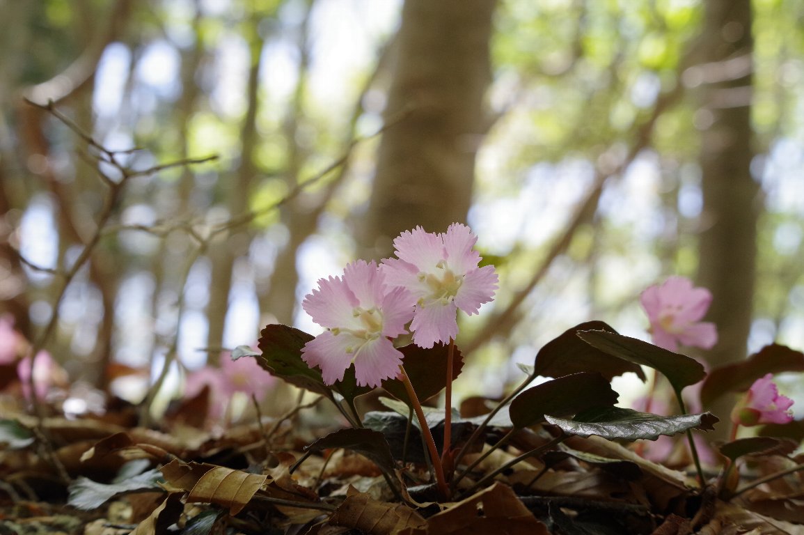 久しぶりに登った、滋賀県の三国山。 山頂付近の林で、点々と咲くイワウチワが出迎えてくれた。 木漏れ日射す落ち葉の間から、並んで咲く2輪が、こちらを見ているようだった。 |