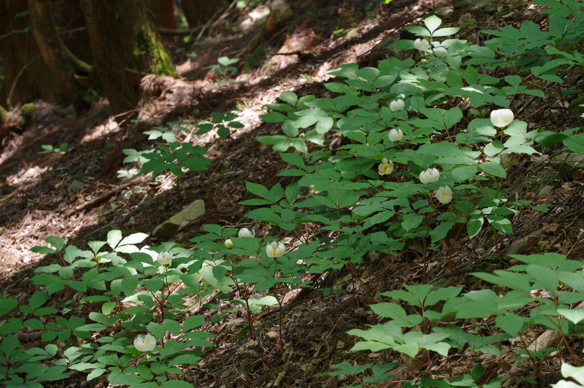 谷筋の山道を小一時間も歩いただろうか、ようやく、山道沿いに咲くヤマシャクヤクの