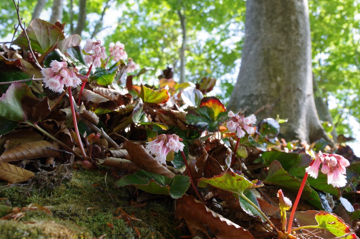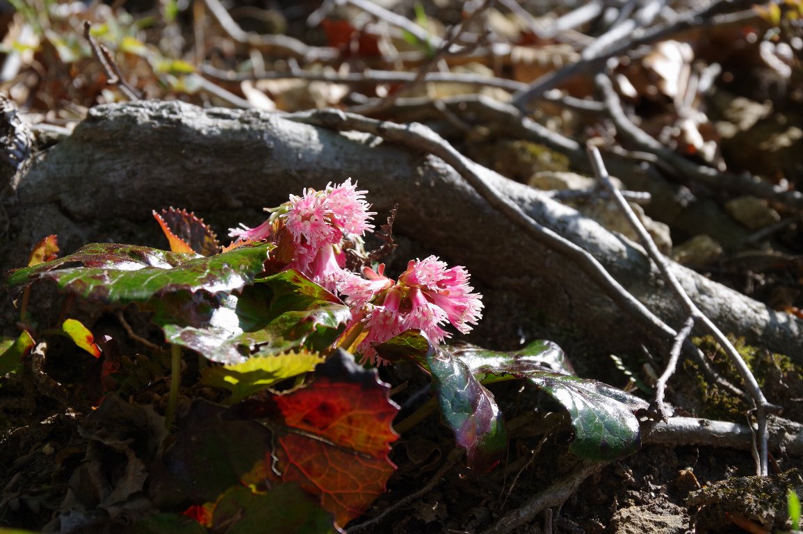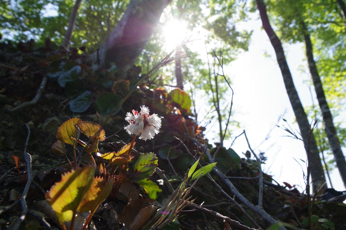 群生するイワカガミを見つけたのは、この時の2年前の秋だった。 翌年の春に訪れたが、あまり咲いておらず、みぞれも降る寒さで、散々だった。 そして今回。林道が雪で阻まれ、車を停めて歩く。ようやく、かわいい花に出会えた。 |