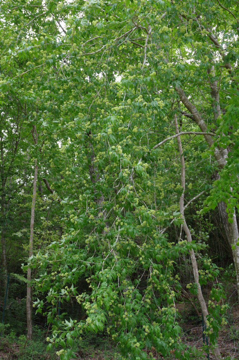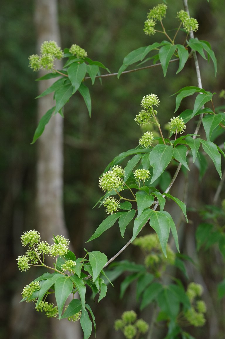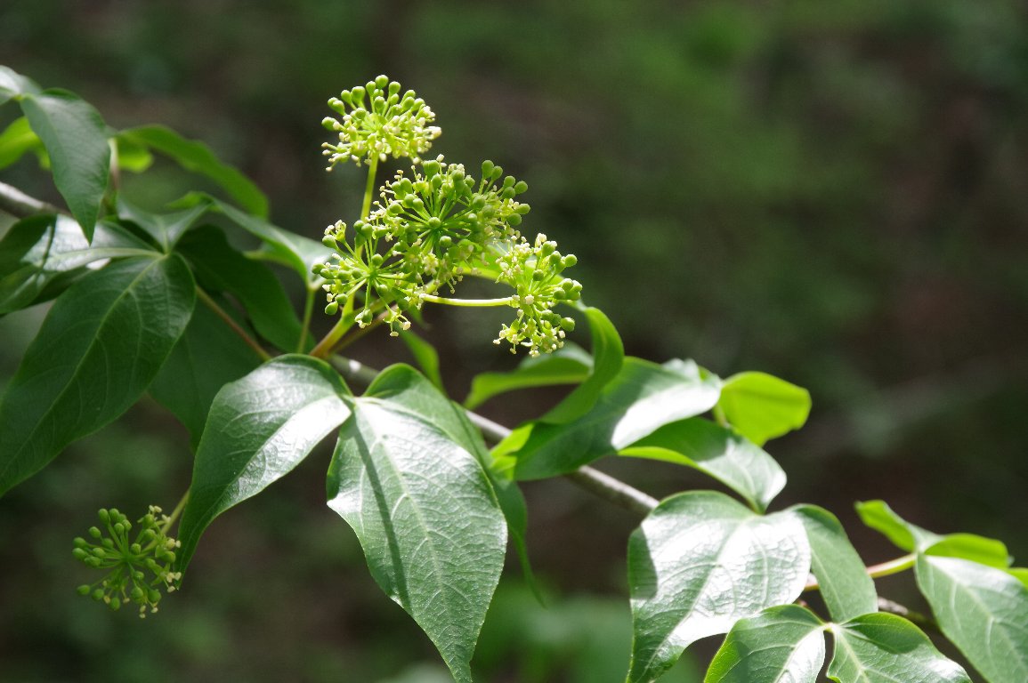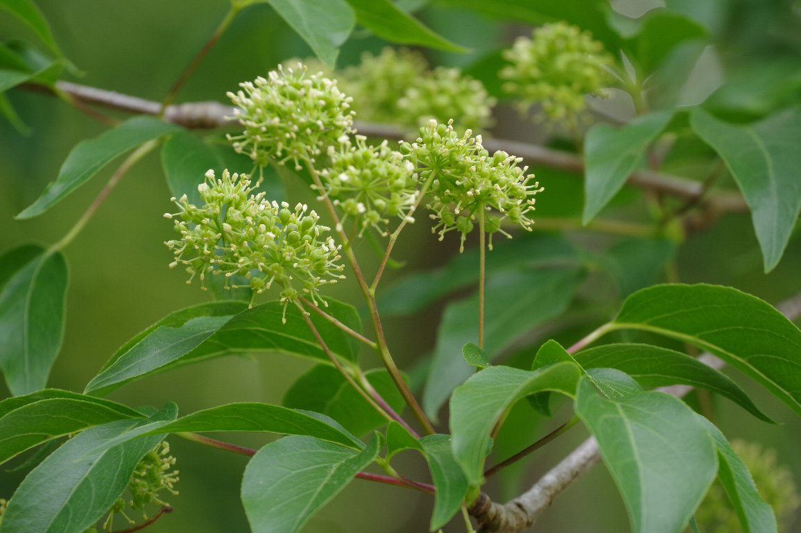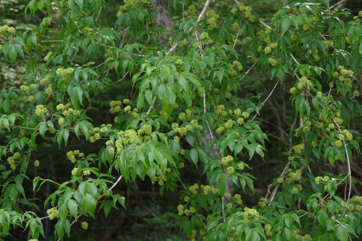 大きな木に、地味な緑色の球形の花が、たくさん咲いている。 ああ、そうか、タカノツメの花だ。 秋にきれいに黄葉するタカノツメは、初夏の今が、花盛りなんだ。 |