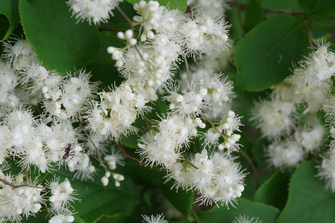 明るい林の縁で、タンナサワフタギが咲いていた。 まっ白いふわふわした花が、枝の上にいっぱい。まるで雪が積もったかのようだった。 |