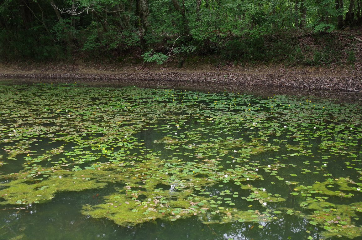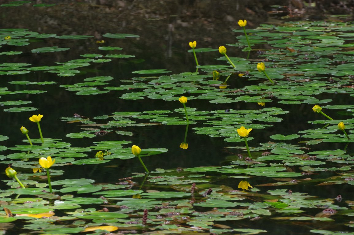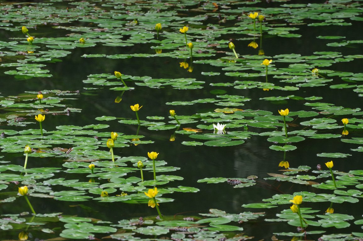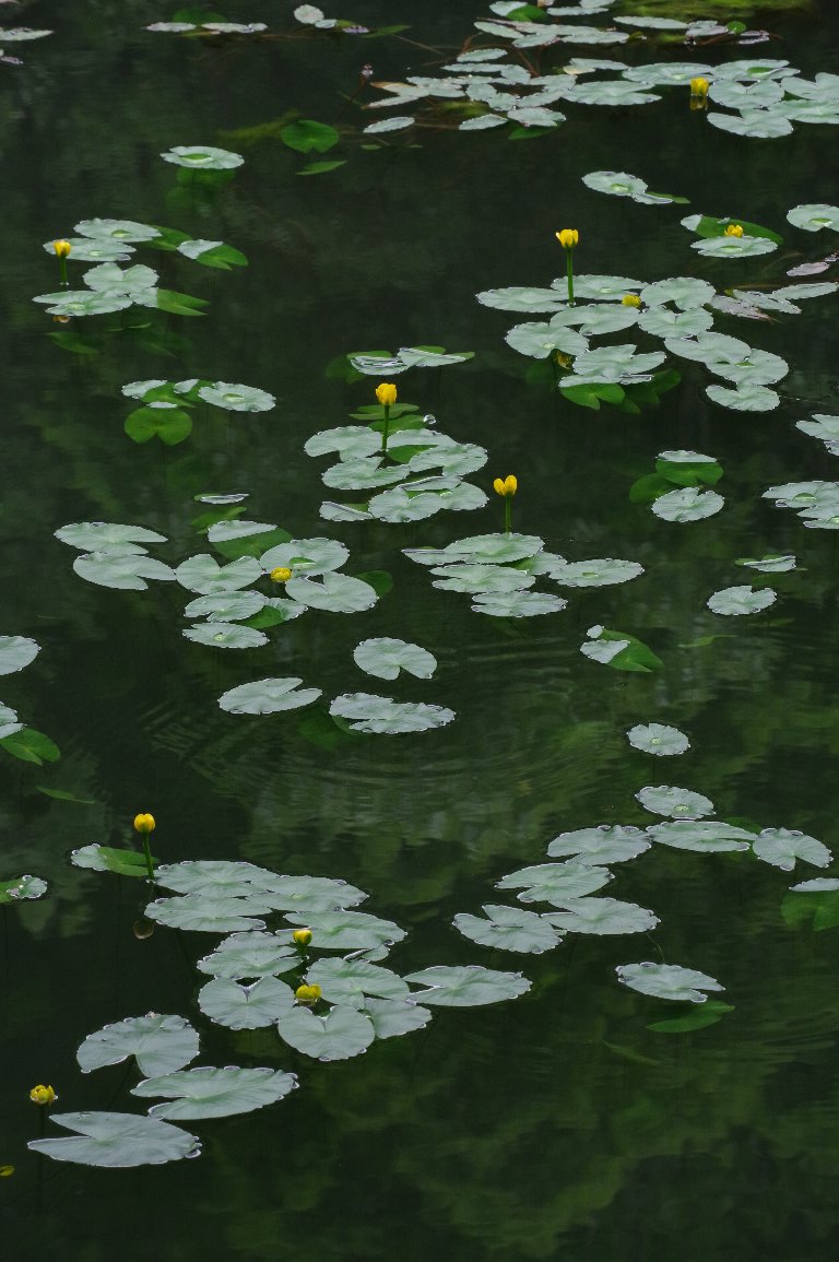 ヒツジグサ満開のため池には、黄色い花も咲いていた。コウホネだ。 やや数は少ないが、負けじと、点々と咲いていた。 白と黄色の、夢の世界が広がっている、そんな景色だった。 |