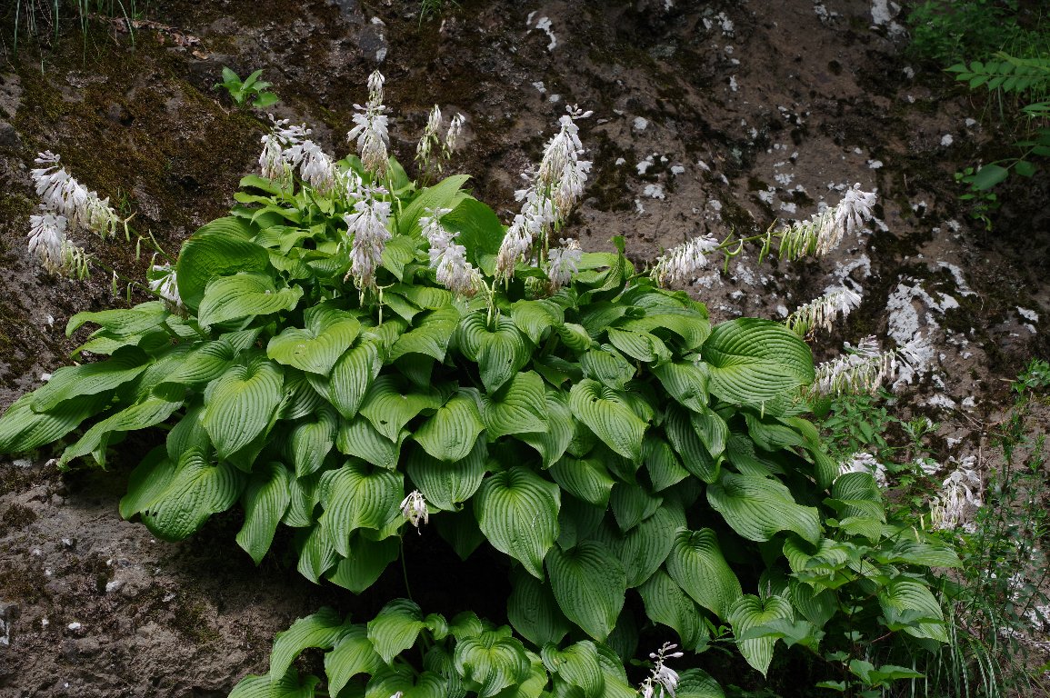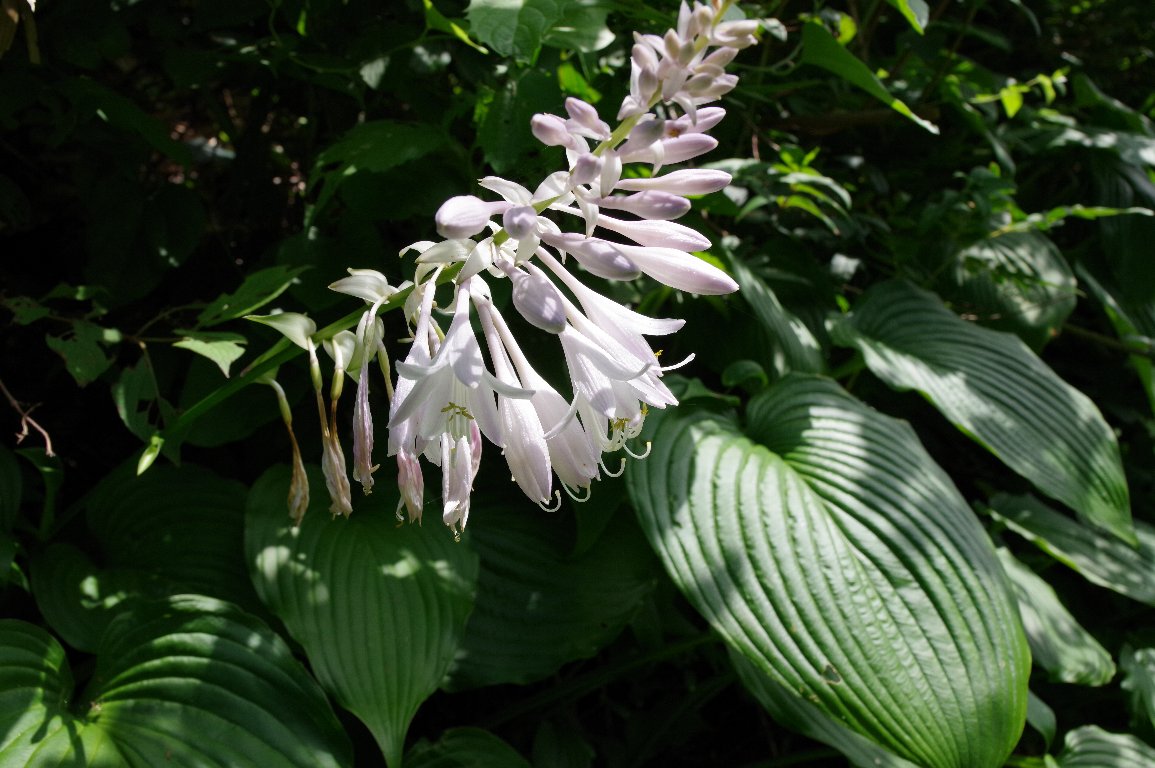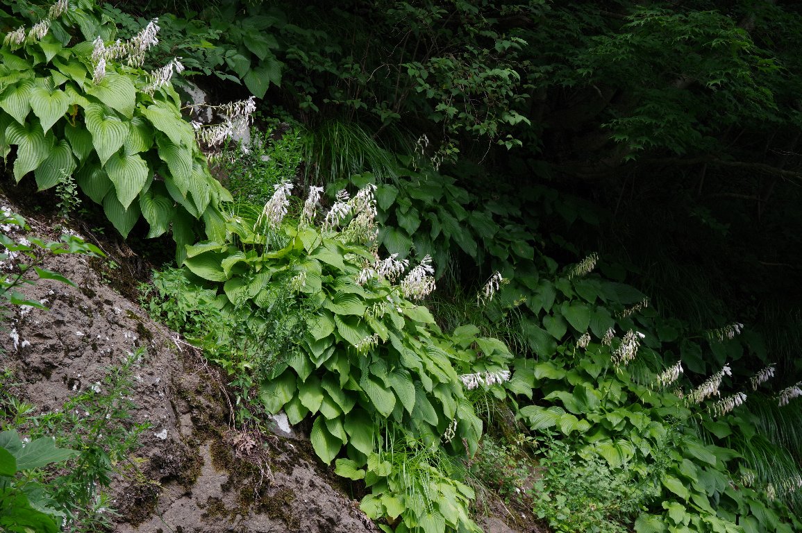 林道のカーブを曲がった時でした。 現れた崖に、幾つものオオバギボウシの大きな株が群生していました。 ちょっとピークは過ぎていましたが、見事な花でした。 |
