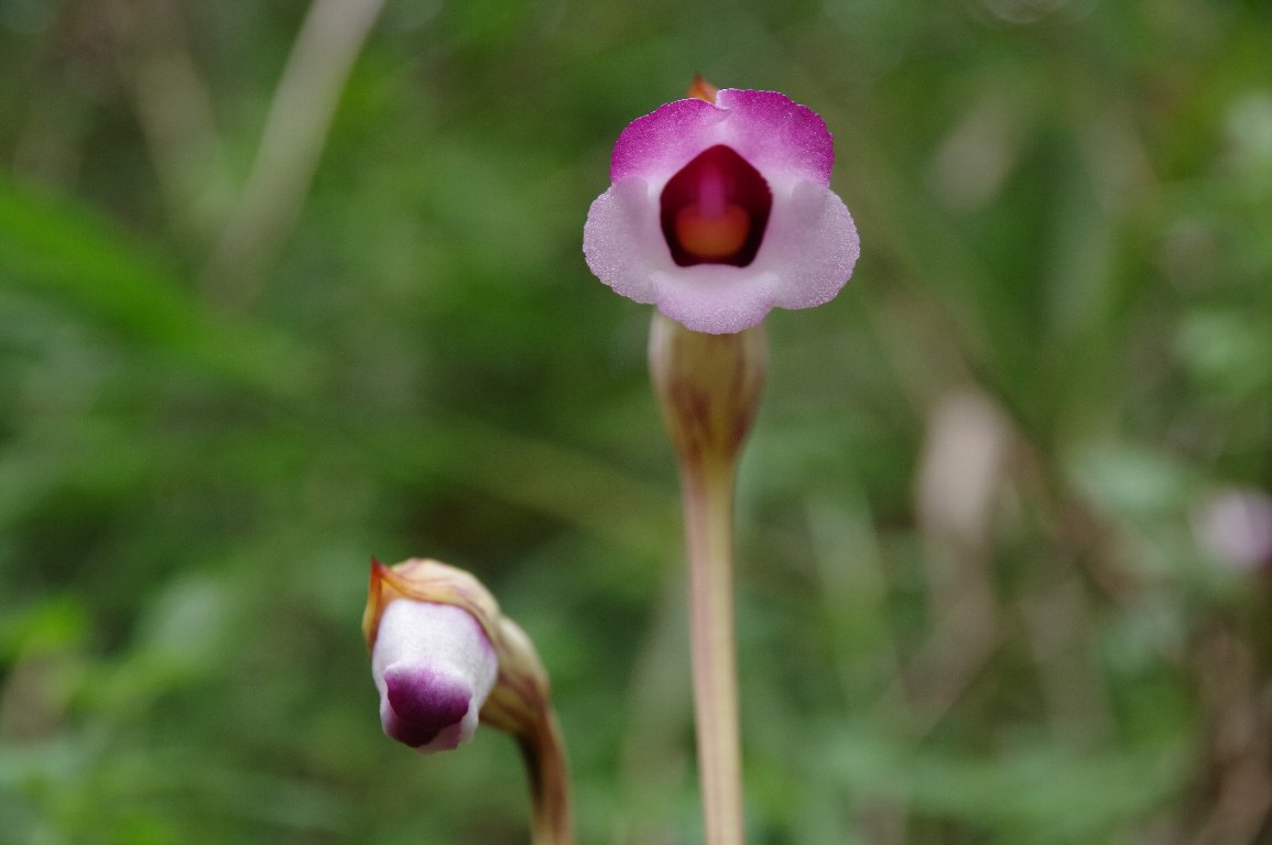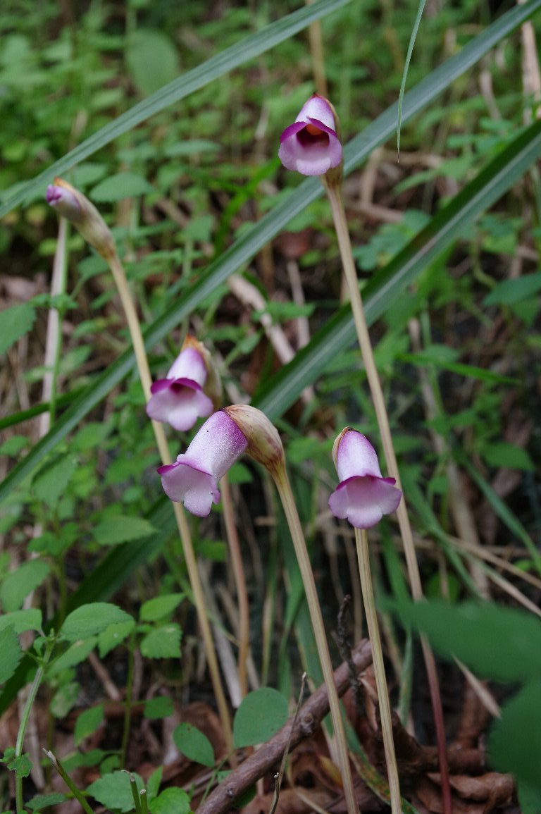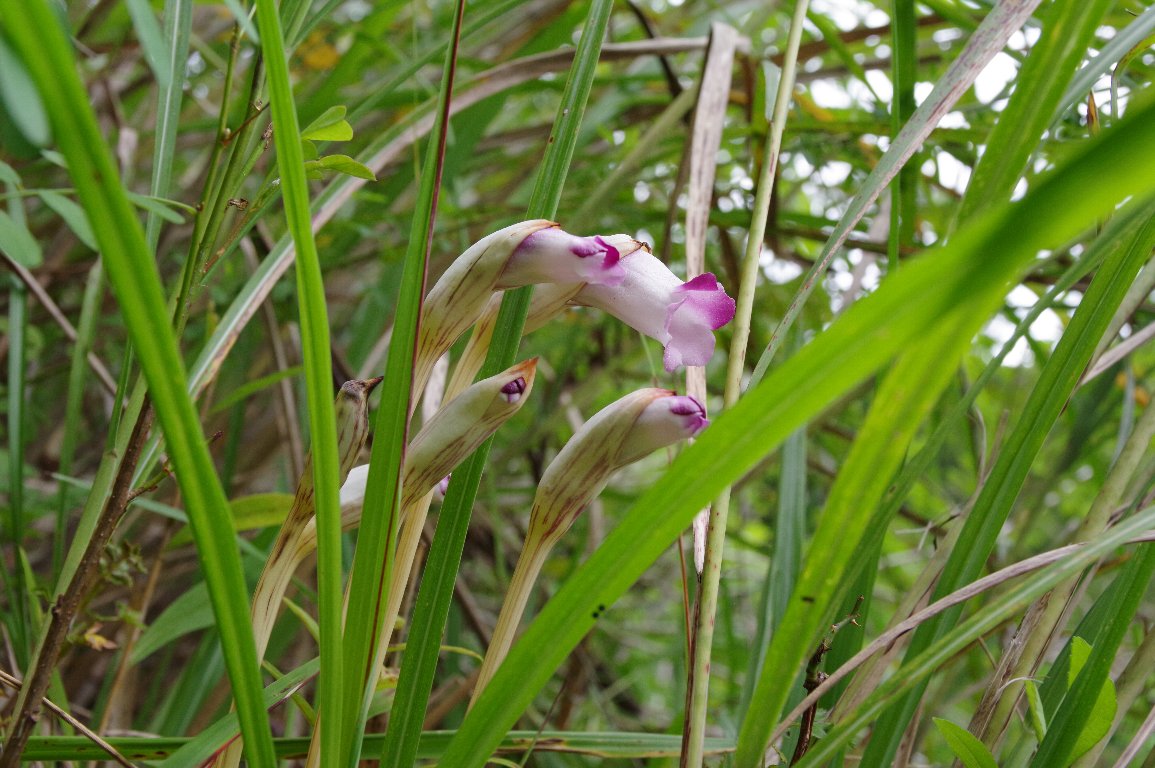 寄生植物は、神出鬼没。 この日、思いがけず、道端のススキの中に、ナンバンギセルの花を見つけた。 南蛮のキセルとはいい得て妙だが、地面から伸びる潜望鏡のようにも見えた。 |