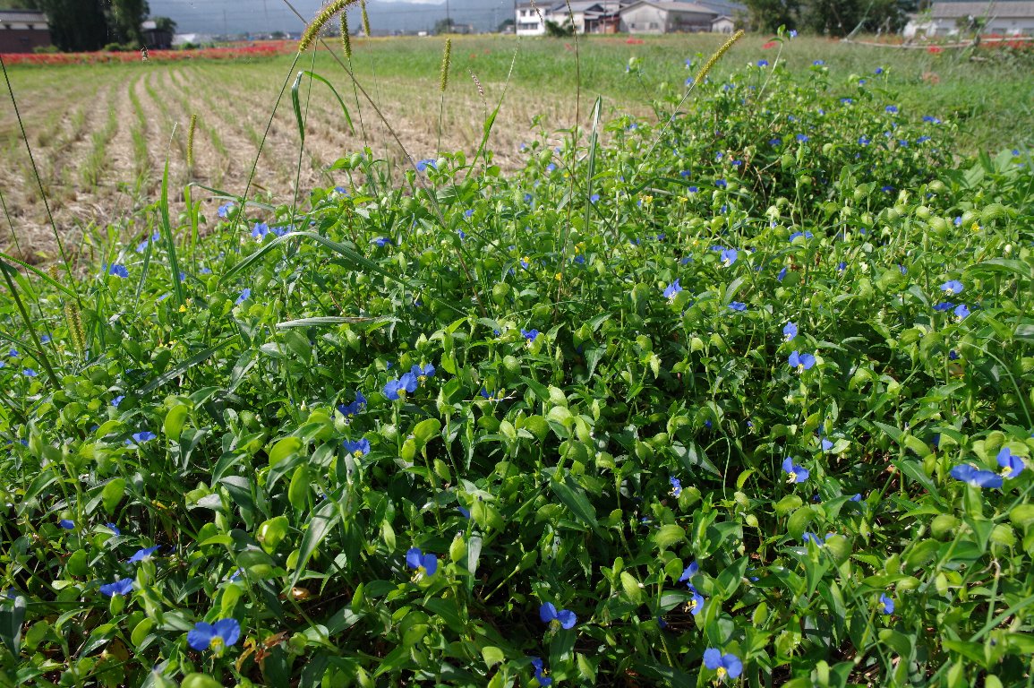 亀岡の、ヒガンバナの名所に出かけた。 ひとしきりヒガンバナを撮り終えて、ふと、みずみずしい青色のツユクサに目が行く。 遠景に融け込むヒガンバナの赤が、青い花を際立たせていた。 |