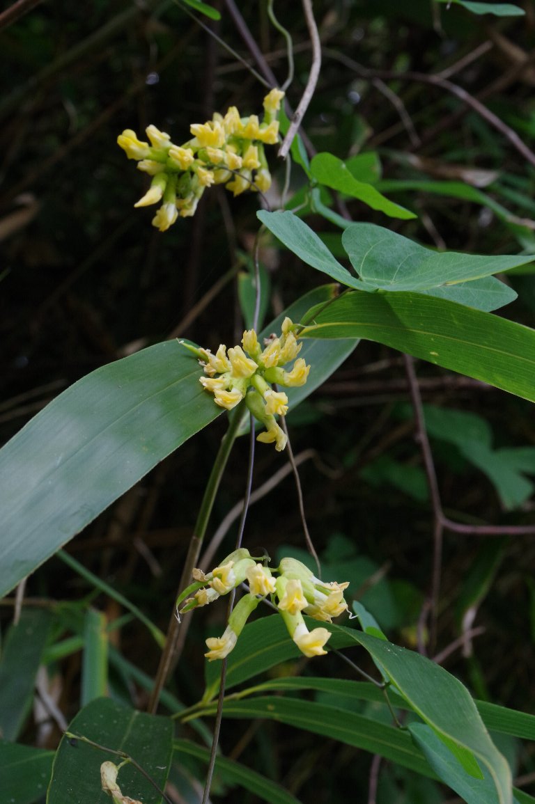 道端の薮に、ちょっと地味な、レモンイエローのノササゲの花が咲いていた。 花は地味だが、やがて、あでやかな紫のさやに、つややかな青黒い豆の実をつけて、 晩秋の野で、とても目立つ存在に変わる。 |