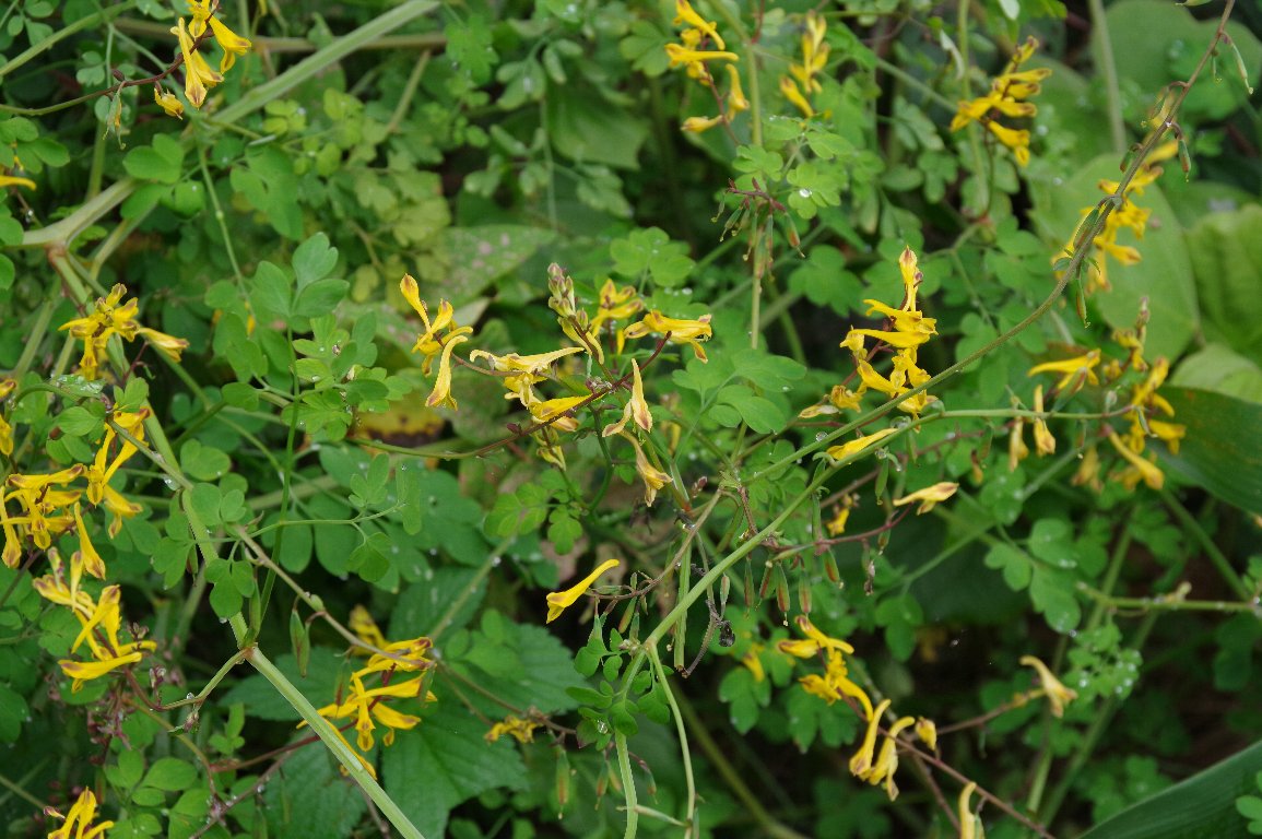 三瓶山麓の道端に、キケマンの花が群れ咲いていた。 ナガミノツルキケマンのようだ。 なよなよとした葉っぱには、まだ、雨露が残っていた。 |
