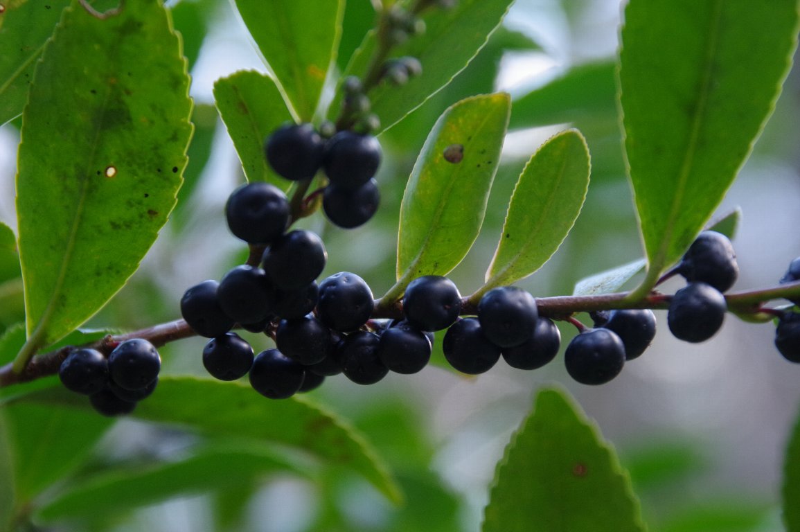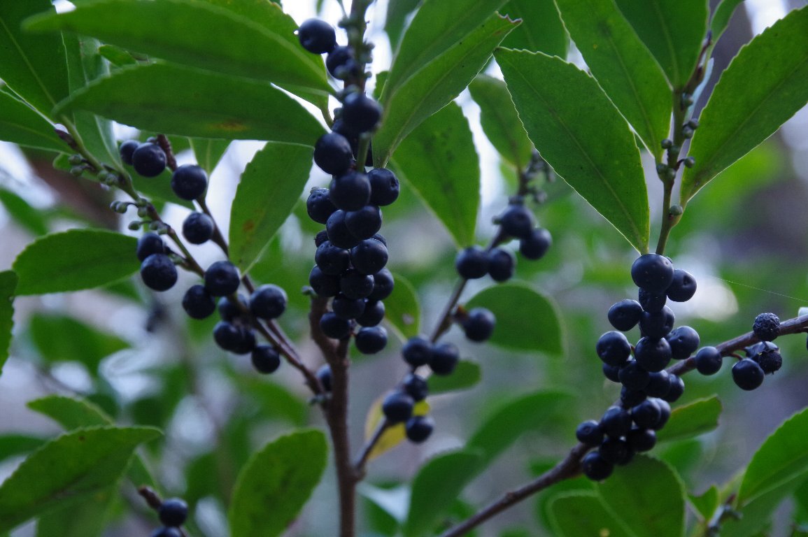晩秋の林で、ヒサカキが、ひっそりと黒々とした実を付けていた。 整然と並んだ実。その先には、春先に咲く花のつぼみを、もう付けていた。 |