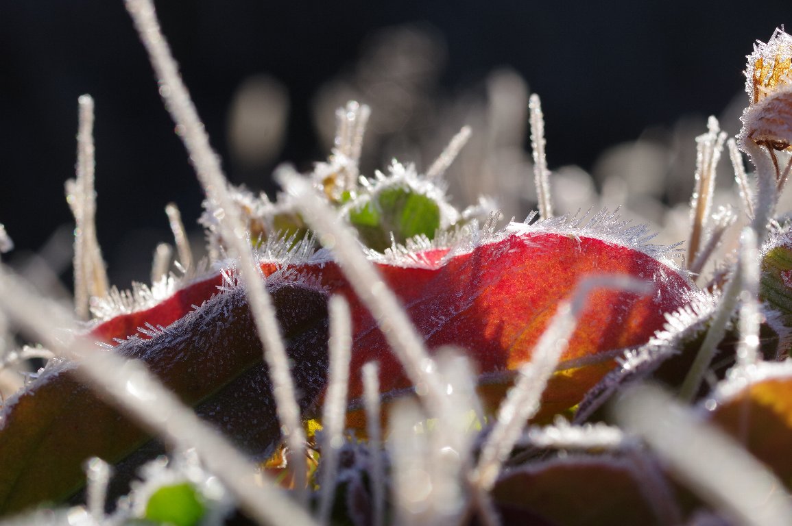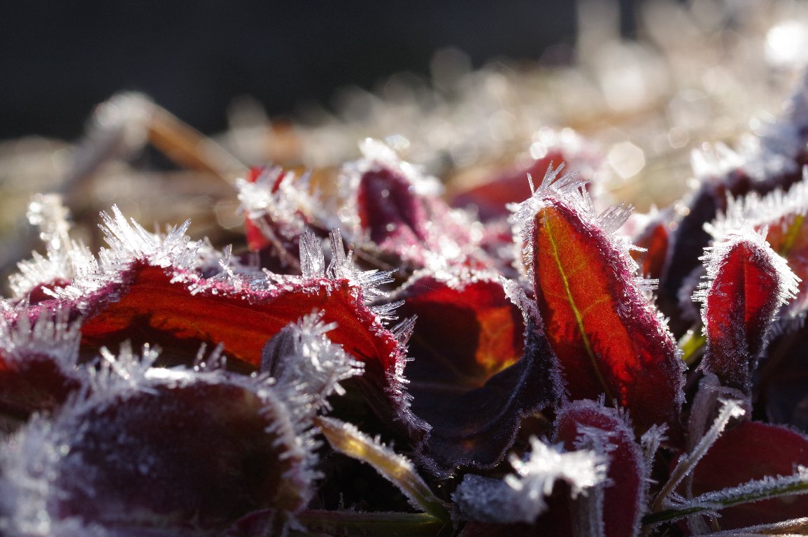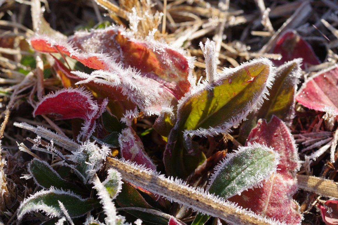 冬の朝早く、田んぼの土手に降りた霜を撮りに行くのは、私の冬の行事となった。 きょうは、何に出会えるだろう? 期待に胸を弾ませながら行くと、真っ赤に輝く、美しいスイバの葉の霜に出会えた。 |