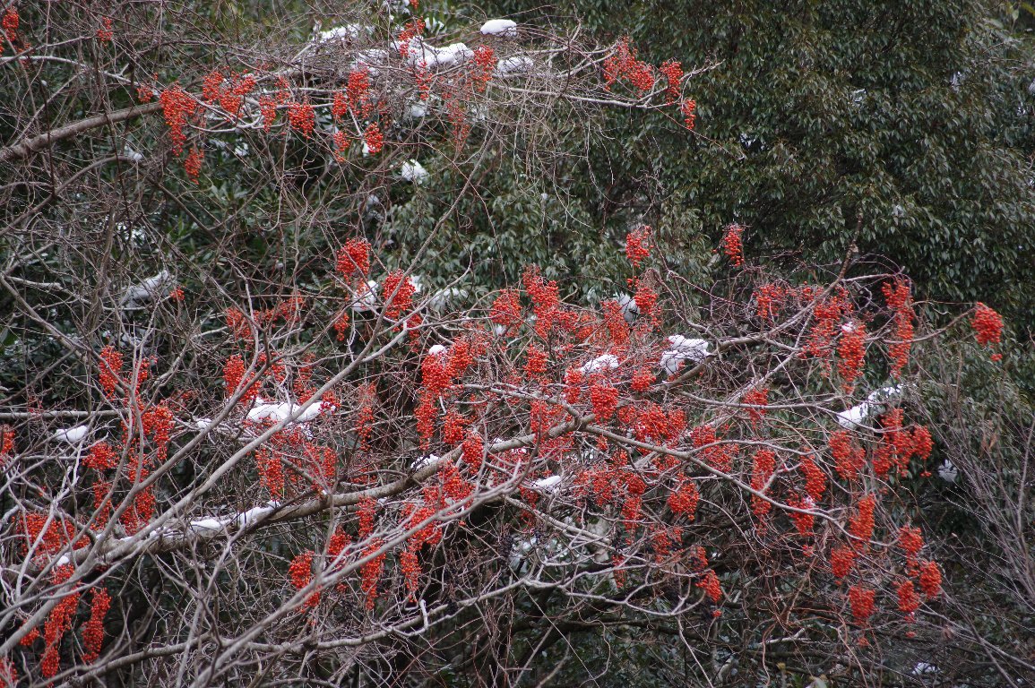 撮影雑記: 冬場に熊野方面に出かけた帰り道に、大きなイイギリの木に出会いました。 赤い実は、冬場には目立つ存在ですが、このイイギリの木は、周りがスギ、ヒノキの植林で 緑色だったので、いっそう引き立っていました。 道からちょっと遠かったので、この時、持っていた望遠レンズでは、これくらいに引き寄せるのが せいいっぱいでした。 ![]() 枝に融け残っていた雪が、ちょうど良いコントラストになっていました。 |