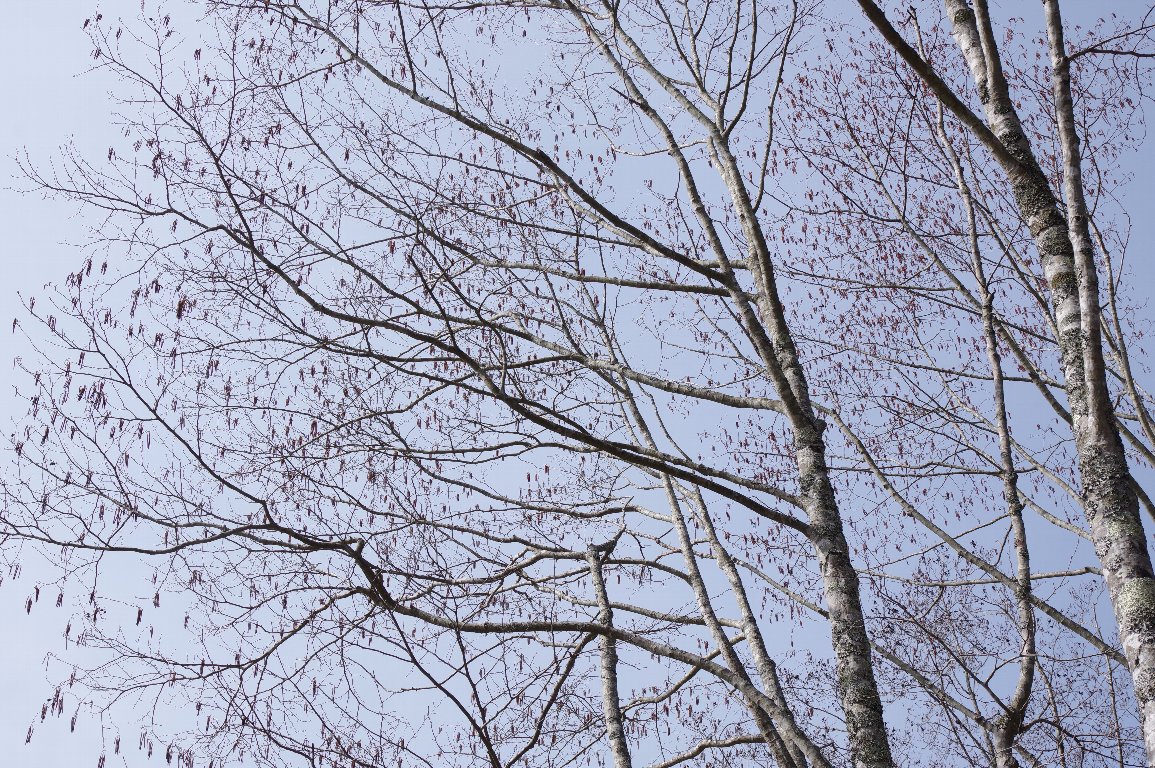 自宅にほど近い里山公園の小さな湿地には、サクラバハンノキ群落が保全されている。 身近にあるのに、春先に咲く花をちゃんと撮ったのは、この時が初めてだった。 枝の高いところに、空にぶら下がるような風媒花がいっぱい並んでいた。 |