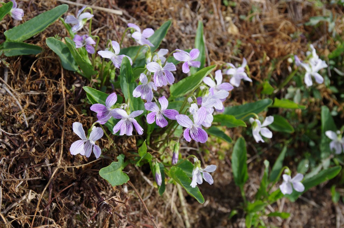春はスミレの季節。野や山のいろんな場所に、いろんなスミレが、競うように咲く。 田んぼの土手で、可憐に咲いているのはアリアケスミレ。 柔らかい色合いの花が、とても楽しげだ。 |