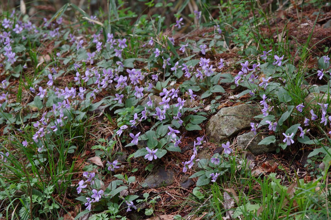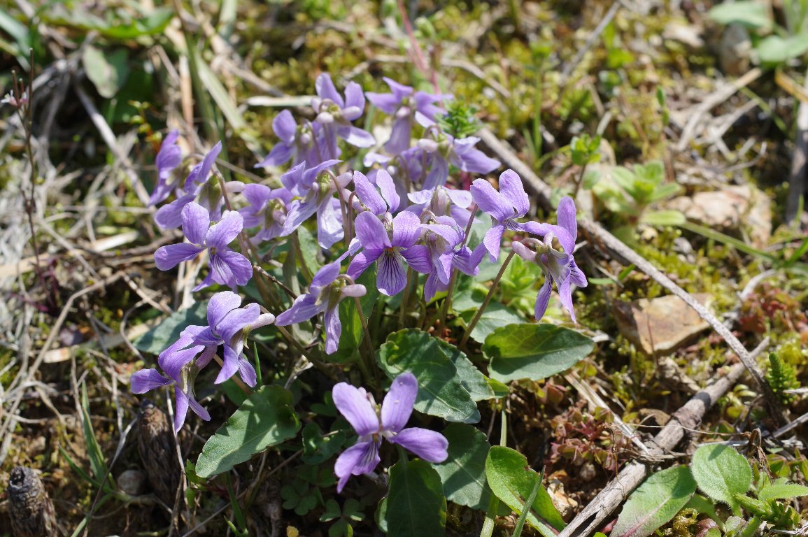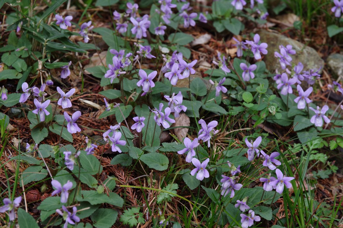 道端に、藤色のスミレが、群れ咲いていた。 葉っぱを見ると、元の方が、特徴的な丸い形をしている。 これが、コスミレなんだ。今までわからなかったコスミレが、ぱっと頭に入った。 |
