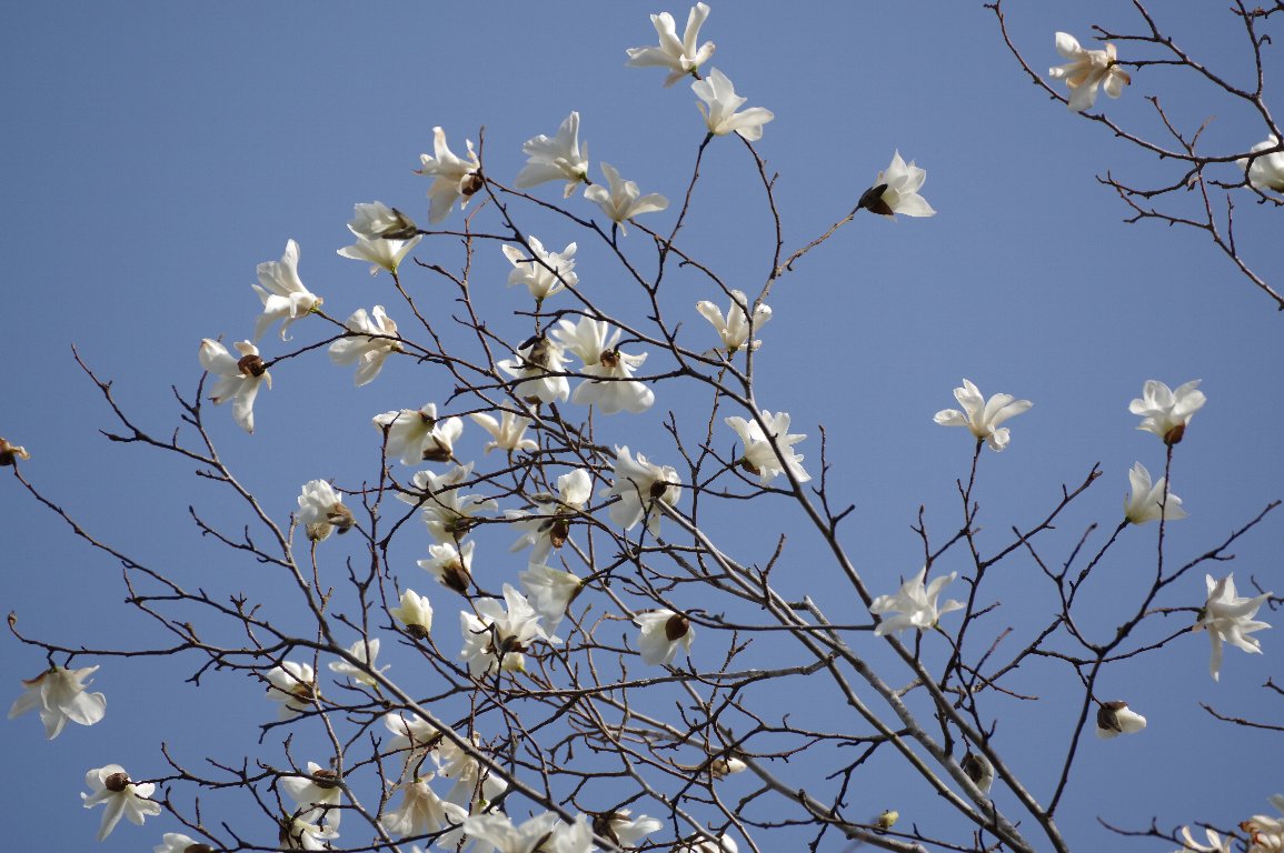 宝塚に越して来て、郊外をドライブして驚いたのは、タムシバの多いこと。 当たり年の春には、山のあちこちで白い花が咲き、ゴマ塩を振りかけたよう。 近くで見上げると、青空バックに、元気いっぱい咲いていた。 |