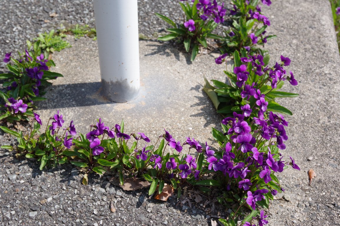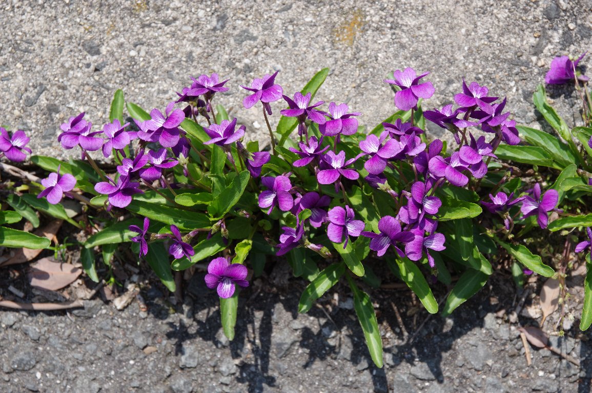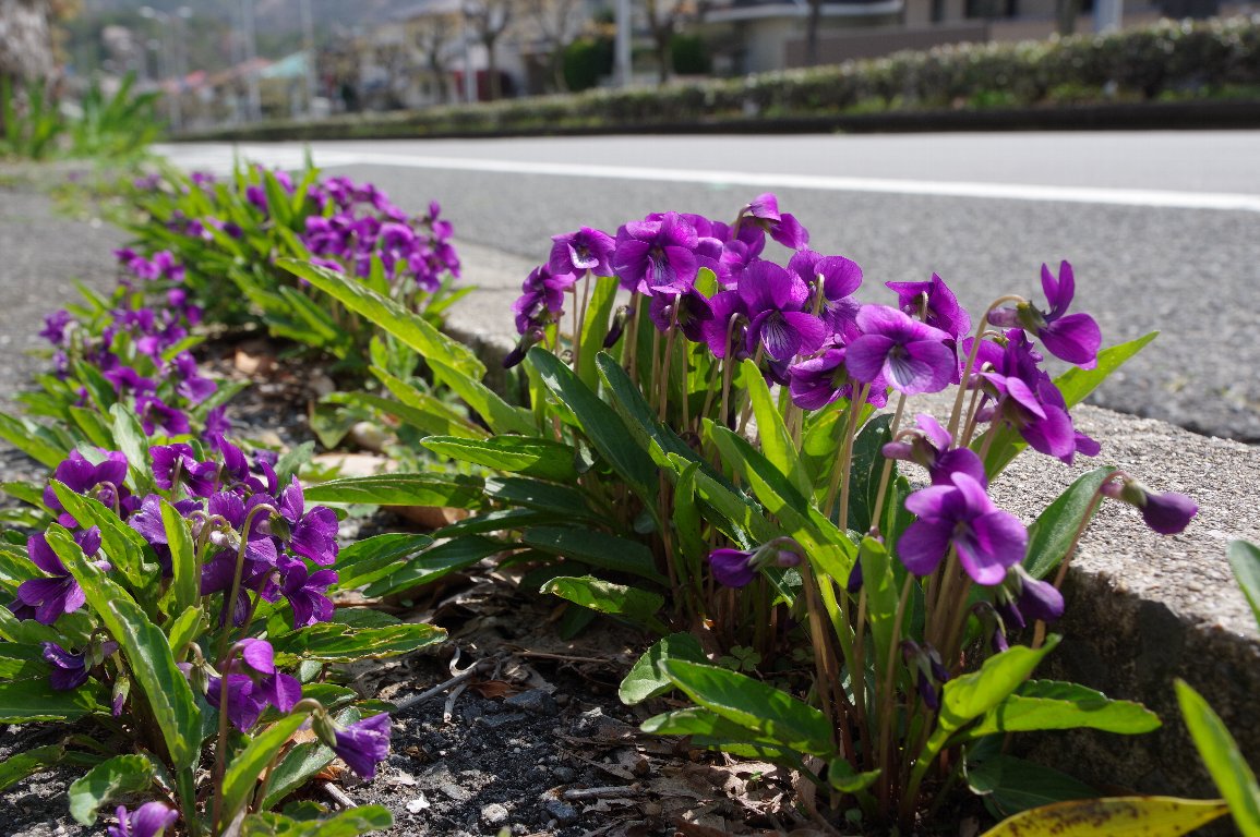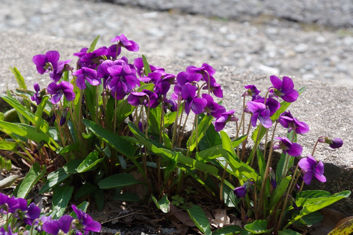 濃い紫色が? なんと、スミレがずらりと並んで咲いていた。 まるで、誰かが植えたかのように、歩道を彩っていた。 |