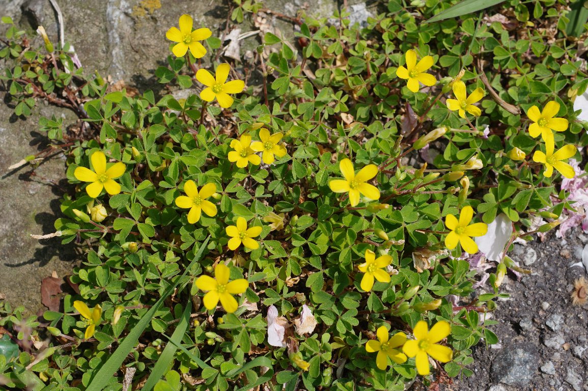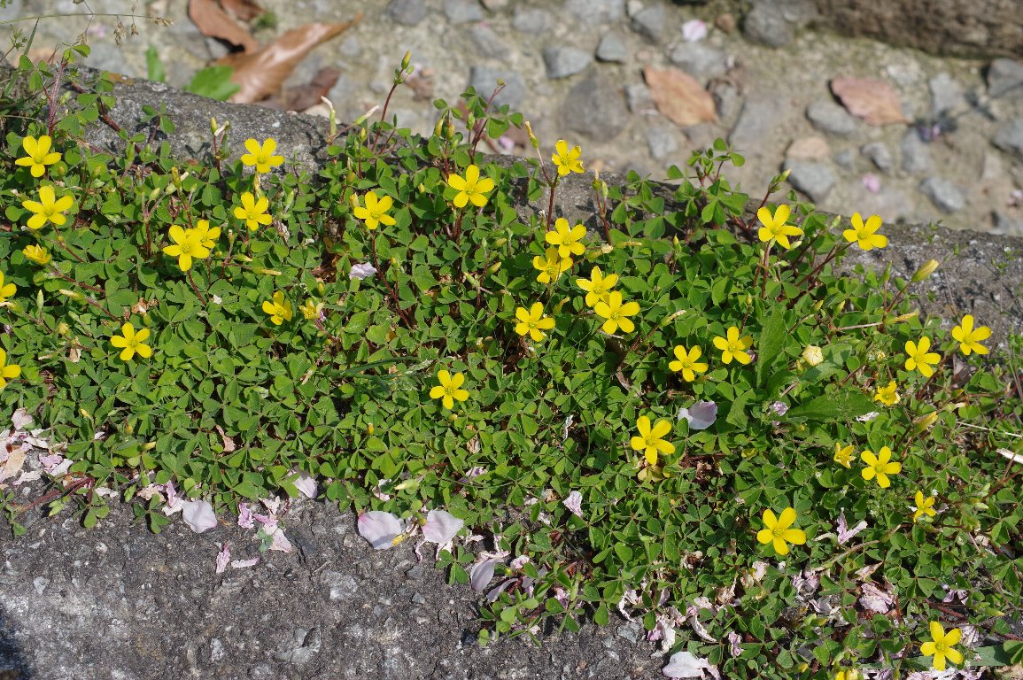いつもは見過ごしがちのカタバミも、あらためて見てみれば、なかなか愛らしい。 舗装された道路のわずかな隙間を縫って、小さなお花畑になっていた。 散った桜の花びらを添えて。 |