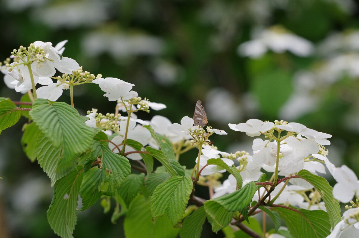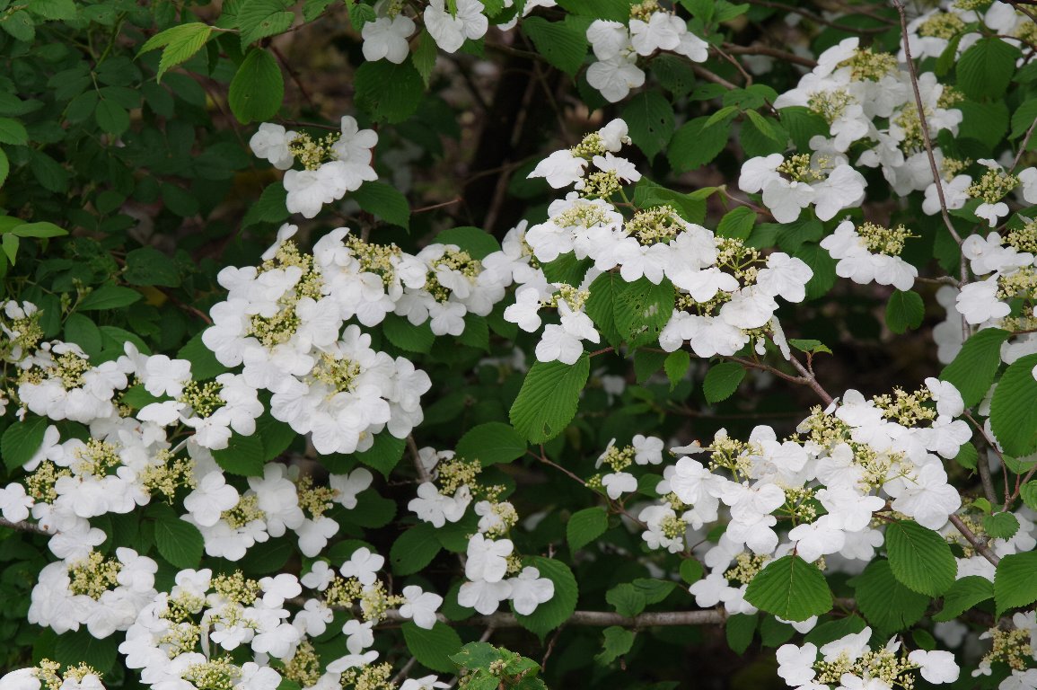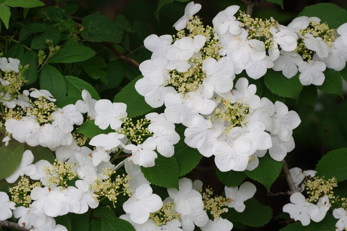 初夏の頃になると、山のあちこちで、いろんな白い花が咲く。 ヤブデマリもその一つで、まあるく広がった花は、遠くからでもよく目立つ。 ついつい、車を停めて、写真を撮らずにはいられない。 |