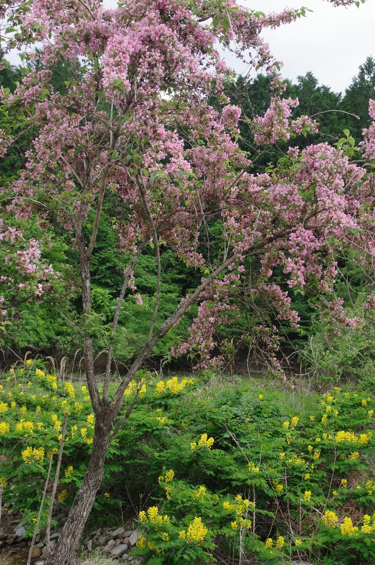 撮影雑記: あきれるほど、花だらけのタニウツギでした。 まるで、全身に花をまとったモンスターのようです。 ![]() こちらが全身。なんでしょうね、これは。 上に突き出た2本の枝が、角?耳?のようでもあります。 ![]() こんなタニウツギの木が、数本ありました。 その1本の下に立って、内側から見上げるように撮りました。 去年の実の殻も残っています。 ![]() どこを切り取っても、尋常ではない花付きです。 ![]() こちらは、別の日、別の場所で撮ったタニウツギ。 タニウツギと言えば、だいたい、こんなイメージです。 ![]() さて、うじゃうじゃの花のタニウツギの向こうに、これまた、いちめんに 鮮やかな黄色い花が。 ![]() <次に続く> |