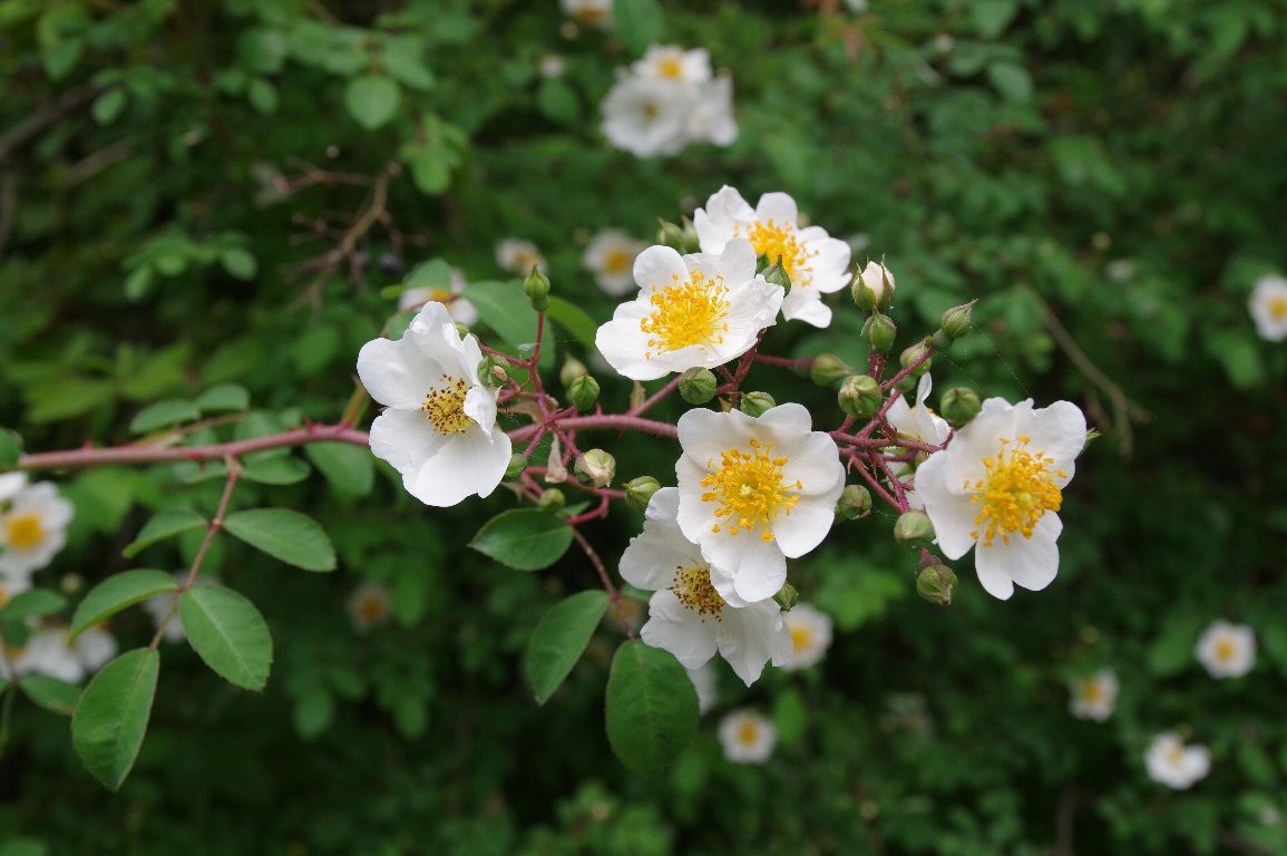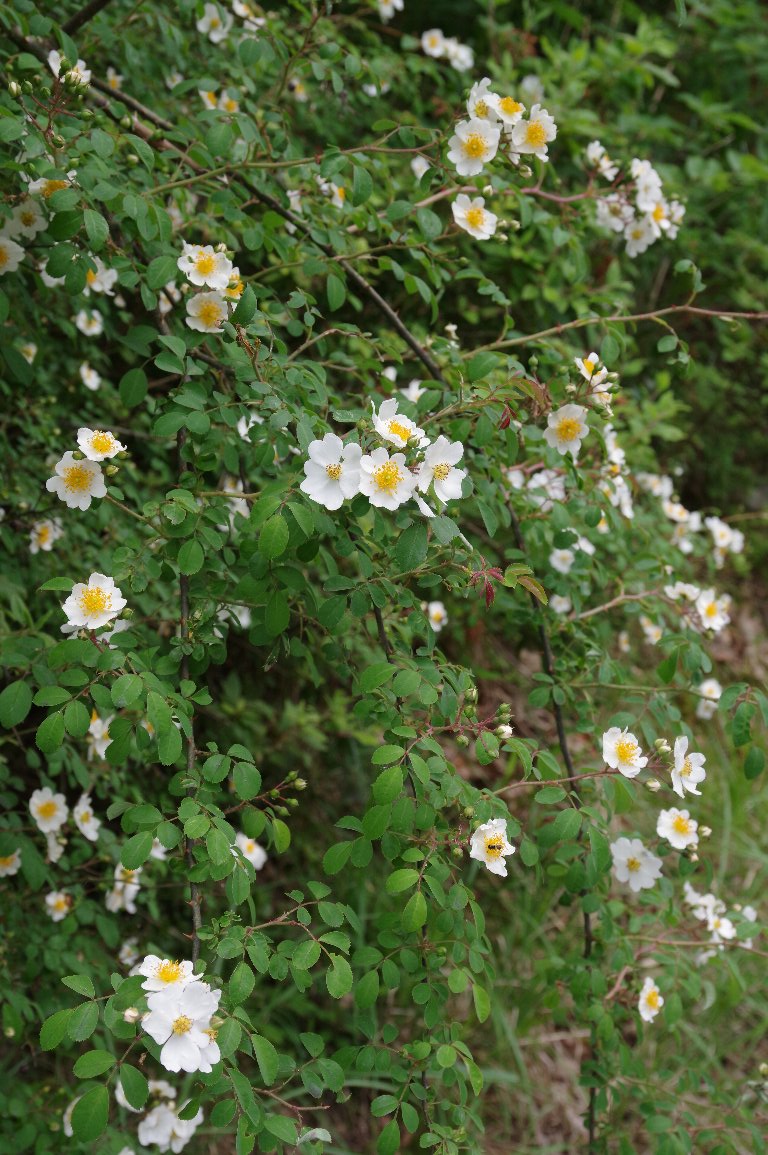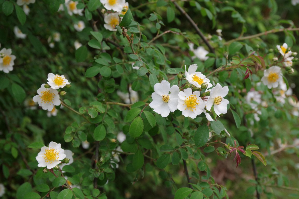 時期の遅いノイバラかと思ったが、なんとなく、雰囲気がちがう。 気になって調べてみると、どうやら、ミヤコイバラらしい。 ミヤコの名の由来は不明らしいが、ノイバラよりちょっとあでやかな姿が、都を連想させるのだろうか。 |