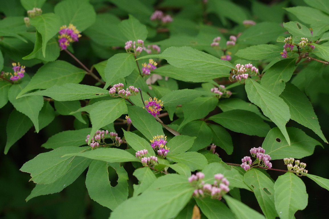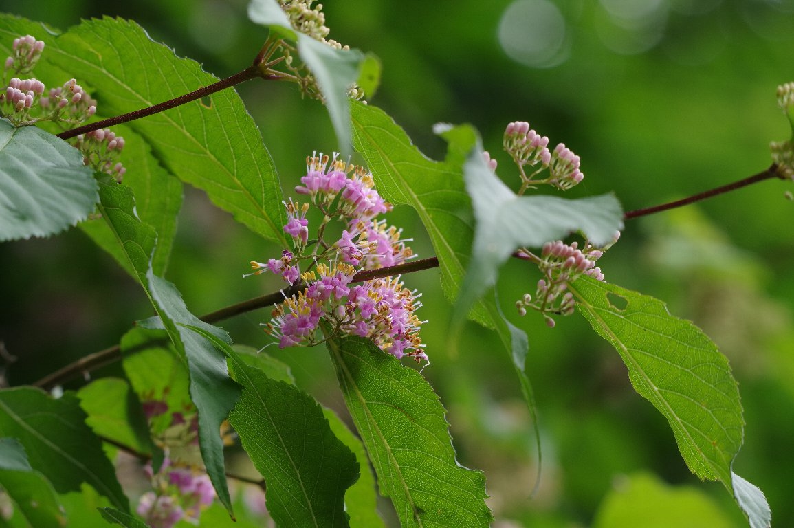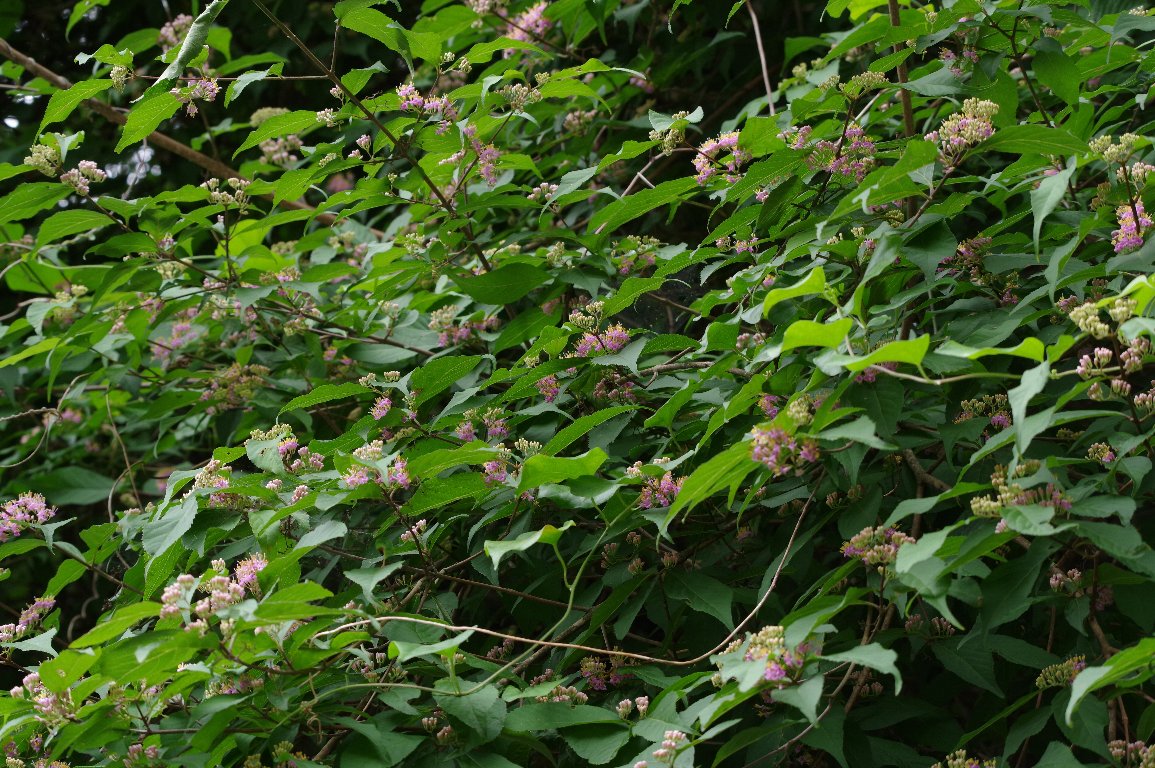川沿いの道に車を停めて散策すると、ムラサキシキブの花がきれいに咲いていた。 どうしても鮮やかな紫の実の方が注目されがちだが、ピンクの花も、小さいが、実に負けない 美しさがある。 |
